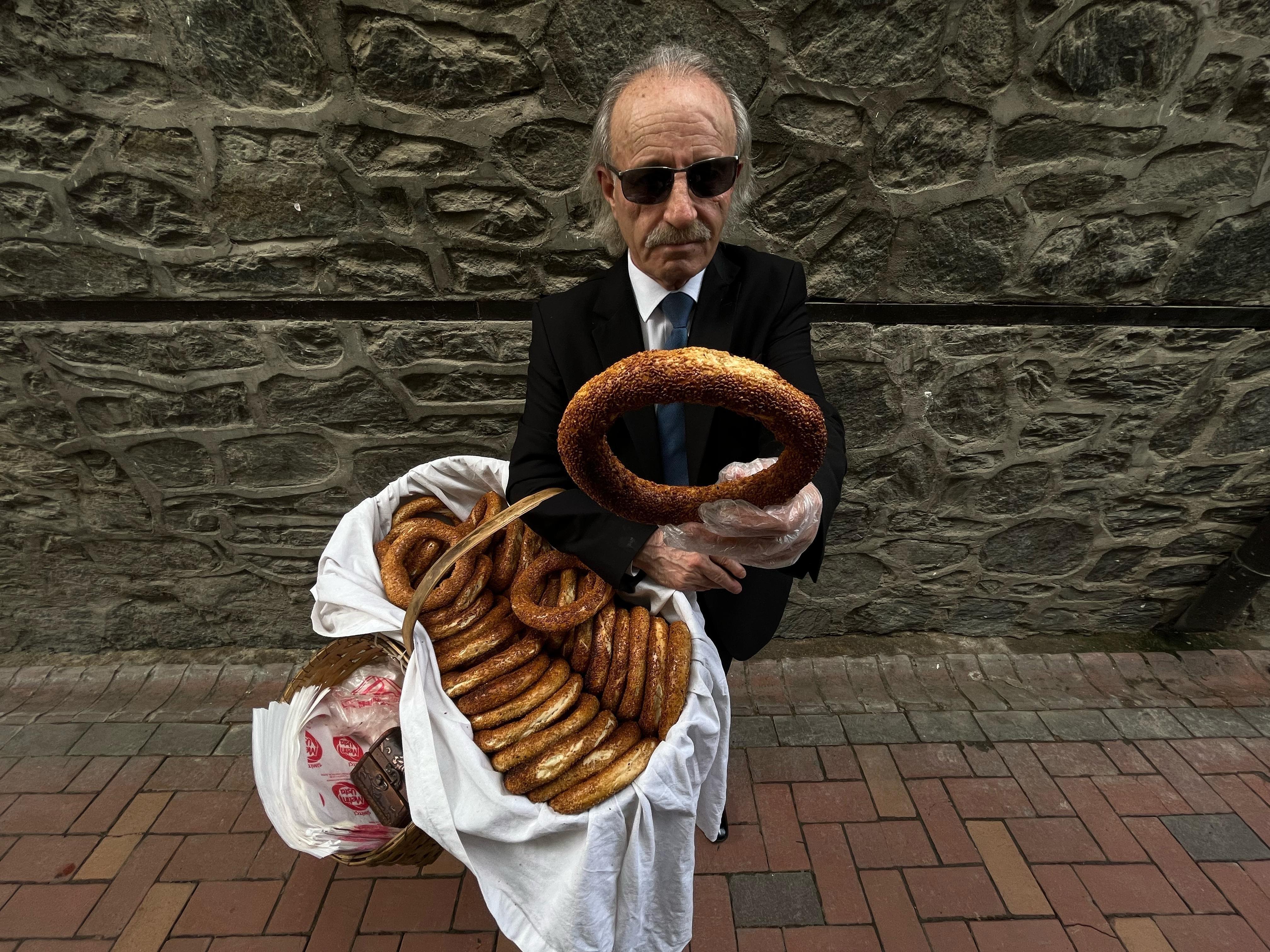 ‘Kravatlı simitçi’ takım elbisesi ve boyalı kunduralarıyla tarihi çarşıları dolaşıp simit satıyor