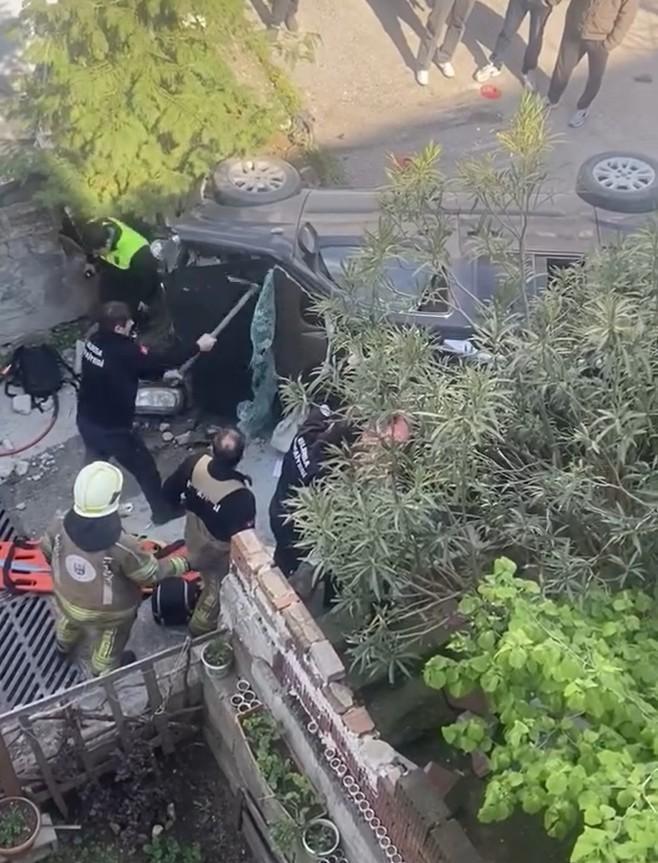 Merdivenlerden düşüp yan yatan araçta sıkışan yolcuyu itfaiye kurtardı; o anlar kamerada