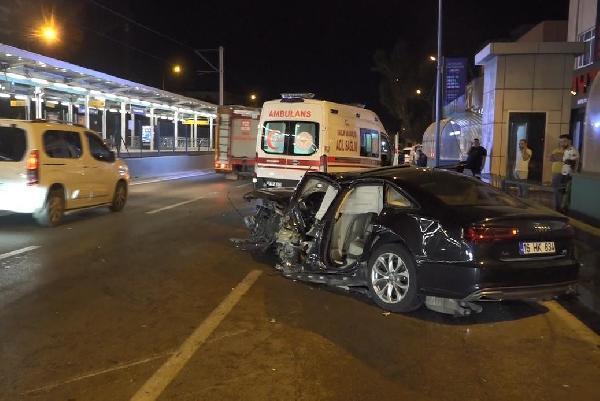 Nevruz İLİMDAROĞLU/BURSA, (DHA)- BURSA'da sürücüsünün direksiyon hakimiyetini kaybettiği lüks otomobil, BursaRay duvarına çarpıp sürüklendikten sonra bariyerlere saplanarak durabildi. Kazada ağır yaralanan sürücü hastaneye kaldırıldı.