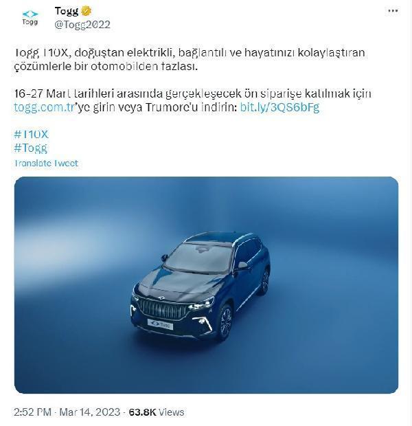 Togg T10X, çekiliş yöntemiyle belirlenecek kullanıcılarıyla 2023 yılı boyunca buluşacak. 16-27 Mart tarihleri arasında T10X için togg.com.tr ve Trumore uygulaması üzerinden ön sipariş süreci gerçekleşecek. App Store, Google Play ve App Gallery üzerinden kullanıma sunulan Trumore uygulamasını indiren veya Togg websitesi üzerinden Tru.ID oluşturan her bir tekil kullanıcı, nakit ya da kredi kartı aracılığıyla cüzdanlarına aktardıkları 60 bin TL ön ödemeyi yaparak, çekiliş sürecine katılmaya hak kazanacak. Çekilişe katılan kullanıcılar, ön ödeme öncesi akıllı cihazlarını modelinden rengine konfigüre edebilecek. 28 Mart’ta noter huzurunda yapılacak dijital çekiliş sistemiyle de ön sipariş sahipleri belirlenecek.