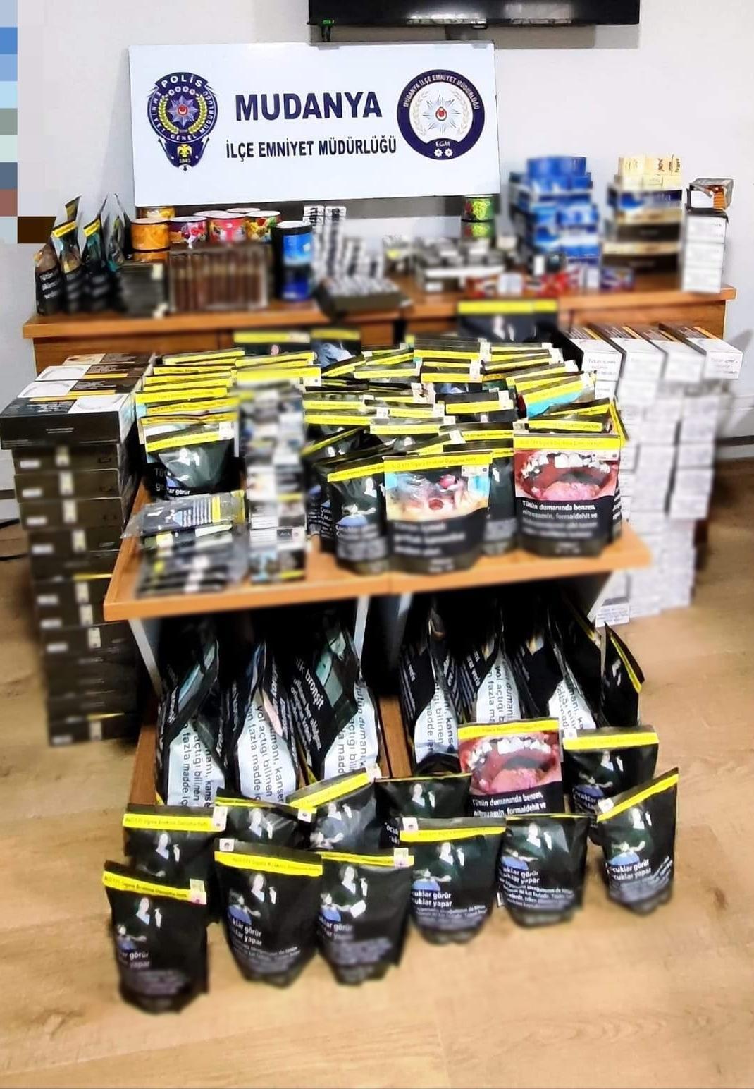 Özgül ATABEY/ MUDANYA (Bursa),(DHA)- BURSA’nın Mudanya ilçesinde bir işletmeye düzenlenen operasyonda, 10 kilo 150 gram nargile tütünü, 9 kilo 250 gram kıyılmış tütün, 20 bin adet boş makaron, 7 bin 120 adet kaçak sigara ile çeşitli tütün mamulleri ele geçirildi. Göz altına alınan işletme sahibi hakkında adli işlem başlatıldı.