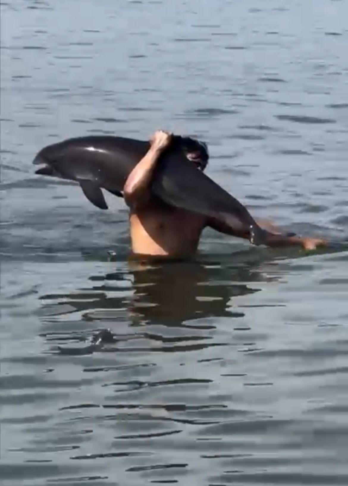 Yüzerken karşılaştığı ölü yunusu omzuna alıp, kıyıya bıraktı; o anlar kamerada