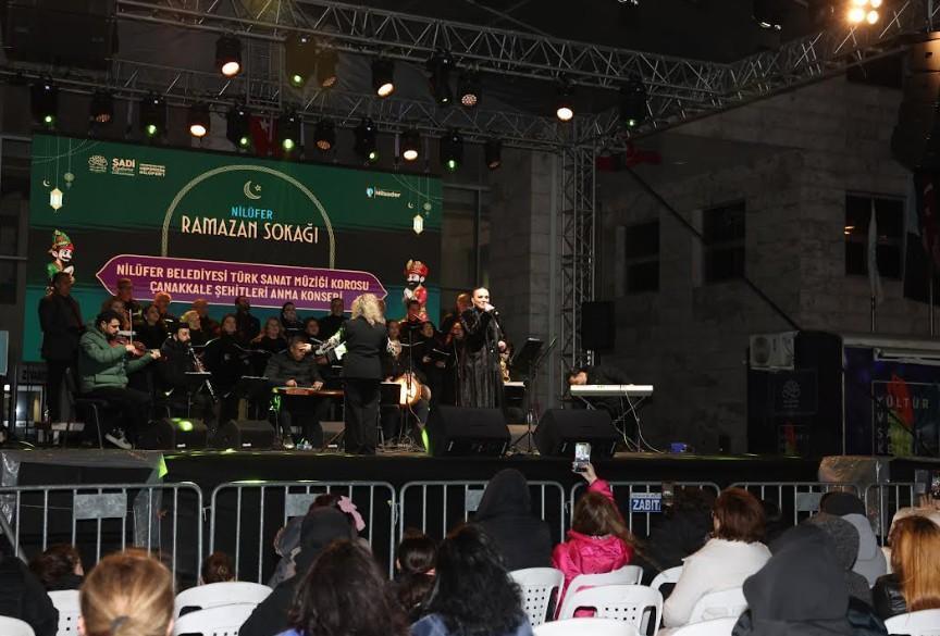 Nilüfer Ramazan Sokağı etkinlikleri, 18 Mart Çanakkale Zaferi ve Şehitleri Anma Günü’ne özel düzenlenen ‘Çanakkale Şehitleri Anma Konseri’ ile son buldu. Nilüfer Belediyesi Türk Sanat Müziği Korosu’nun sahne aldığı gecede, Atatürk’ün sevdiği şarkılar ve Çanakkale türküleri seslendirildi. Filiz Başıbüyük’ün şefliğini yaptığı koro, “Hey On Beşli”, “Hoş Gelişler Ola Mustafa Kemal Paşa”, “Çanakkale İçinde Aynalı Çarşı”, “İzmir’in Dağları”, “Ah Bir Ateş Ver” gibi eserlerin yanı sıra Rumeli türkülerini de seslendirdi. (DHA)