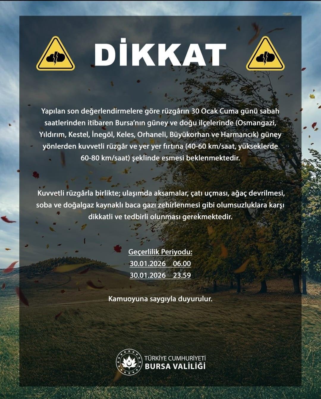 Bursa Valiliği’nden yapılan açıklamada, “Yapılan son değerlendirmelere göre rüzgarın 30 Ocak Cuma günü sabah saatlerinden itibaren Bursa’nın güney ve doğu ilçelerinde (Osmangazi, Yıldırım, Kestel, İnegöl, Keles, Orhaneli, Büyükorhan ve Harmancık) güney yönlerden kuvvetli rüzgar ve yer yer fırtına (40–60 km/saat, yükseklerde 60–80 km/saat) şeklinde esmesi beklenmektedir. Kuvvetli rüzgarla birlikte ulaşımda aksamalar, çatı uçması, ağaç devrilmesi, soba ve doğalgaz kaynaklı baca gazı zehirlenmesi gibi olumsuzluklara karşı dikkatli ve tedbirli olunması gerekmektedir” ifadeleri kullanıldı. (DHA)