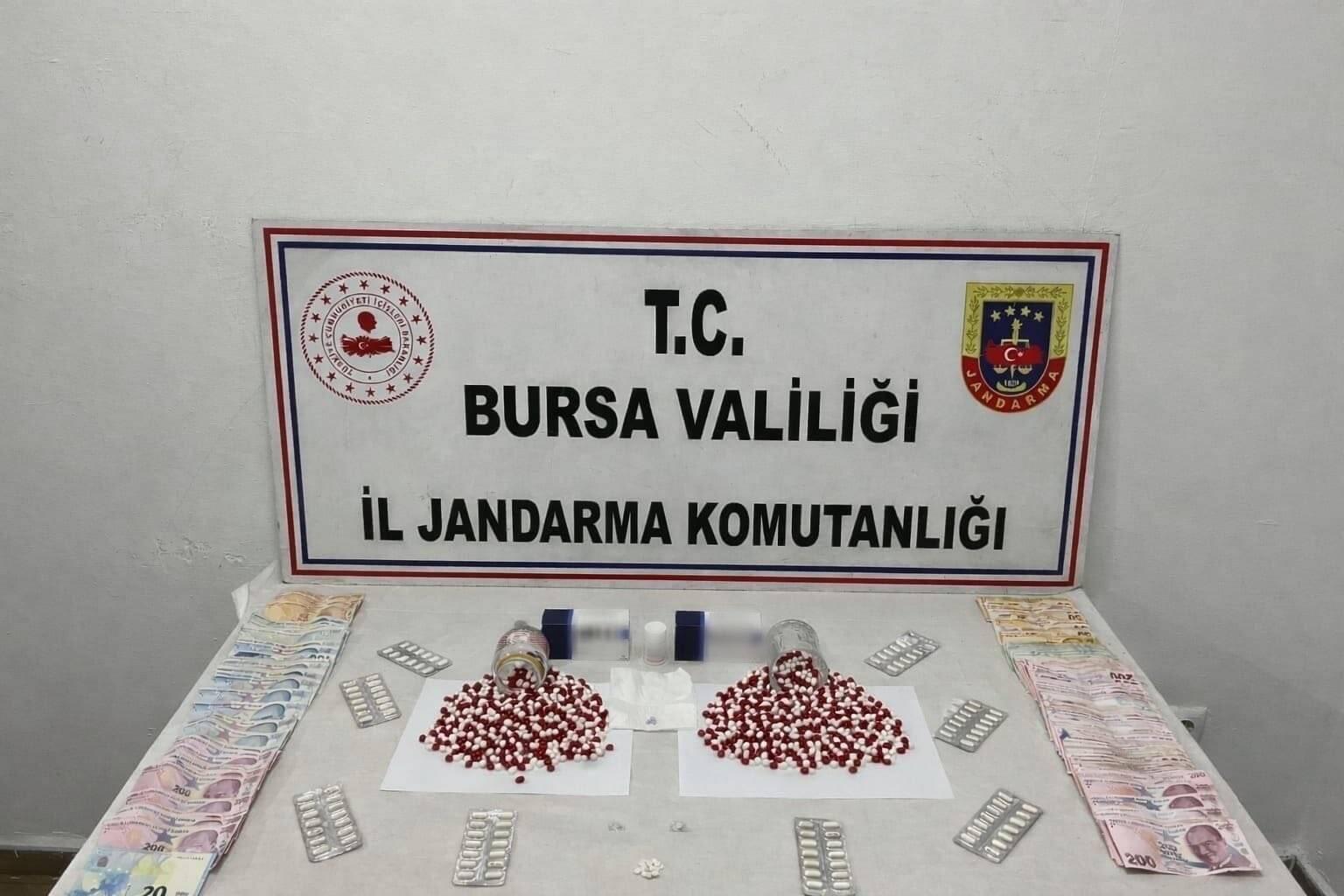 Osman SAK/ BURSA, (DHA)- BURSA İl Jandarma Komutanlığı’nın düzenlediği uyuşturucu operasyonunda bin 39 adet sentetik hap ve uyuşturucu madde ticaretinden elde edildiği değerlendirilen 27 bin 310 lira ile 20 avro ele geçirildi.