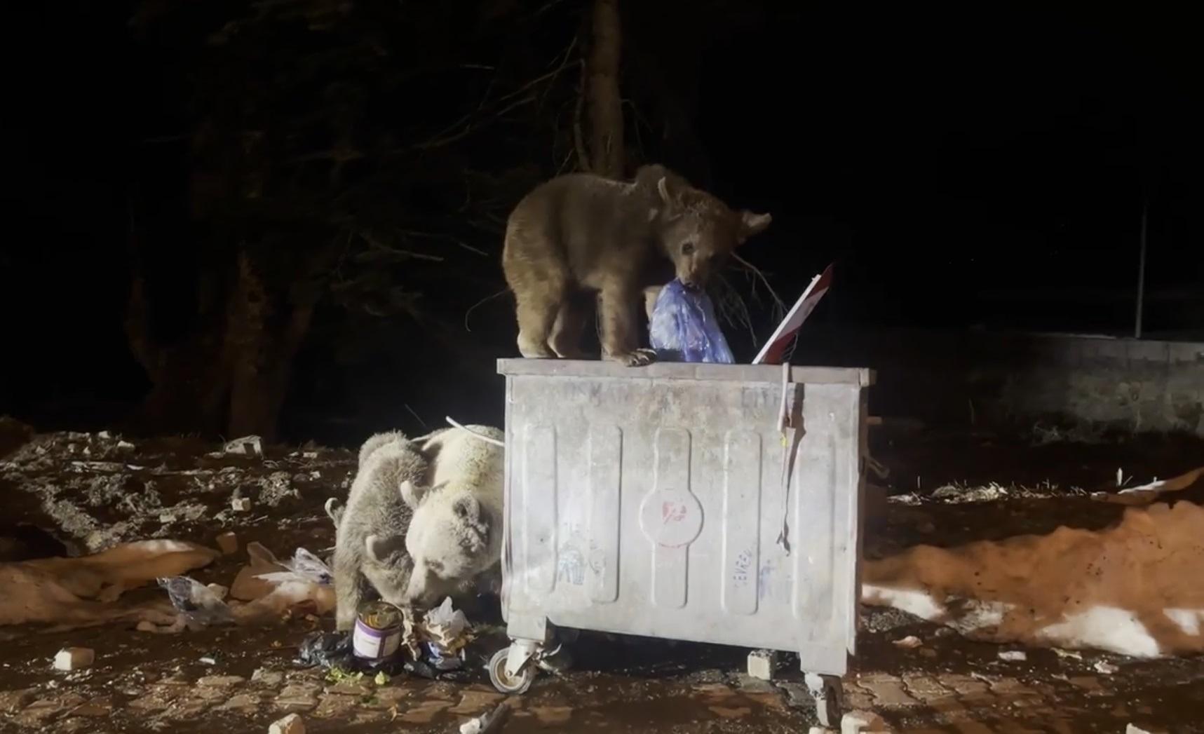 Kar kalınlığının 142 santimetre olarak ölçüldüğü Uludağ’da, kış uykusundan uyanan ayılar yiyecek aramak için yerleşim alanlarına inmeye başladı. Ormandan çıkan 3’ü yavru 4 ayı, Sarıalan bölgesine gelerek yol kenarındaki çöp konteynerlerinde yiyecek aradı. O anlar, Ramazan Bayramı tatili için ailesiyle birlikte Uludağ’a çıkan sanal medya ünlüsü Nazlı Zuhal Aygan tarafından cep telefonuyla kaydedildi. Görüntülerde, Aygan ailesinin yaşadığı panik ve şaşkınlık dikkat çekerken, ayıların bir süre daha bölgede yiyecek aramayı sürdürdüğü görüldü. (DHA)