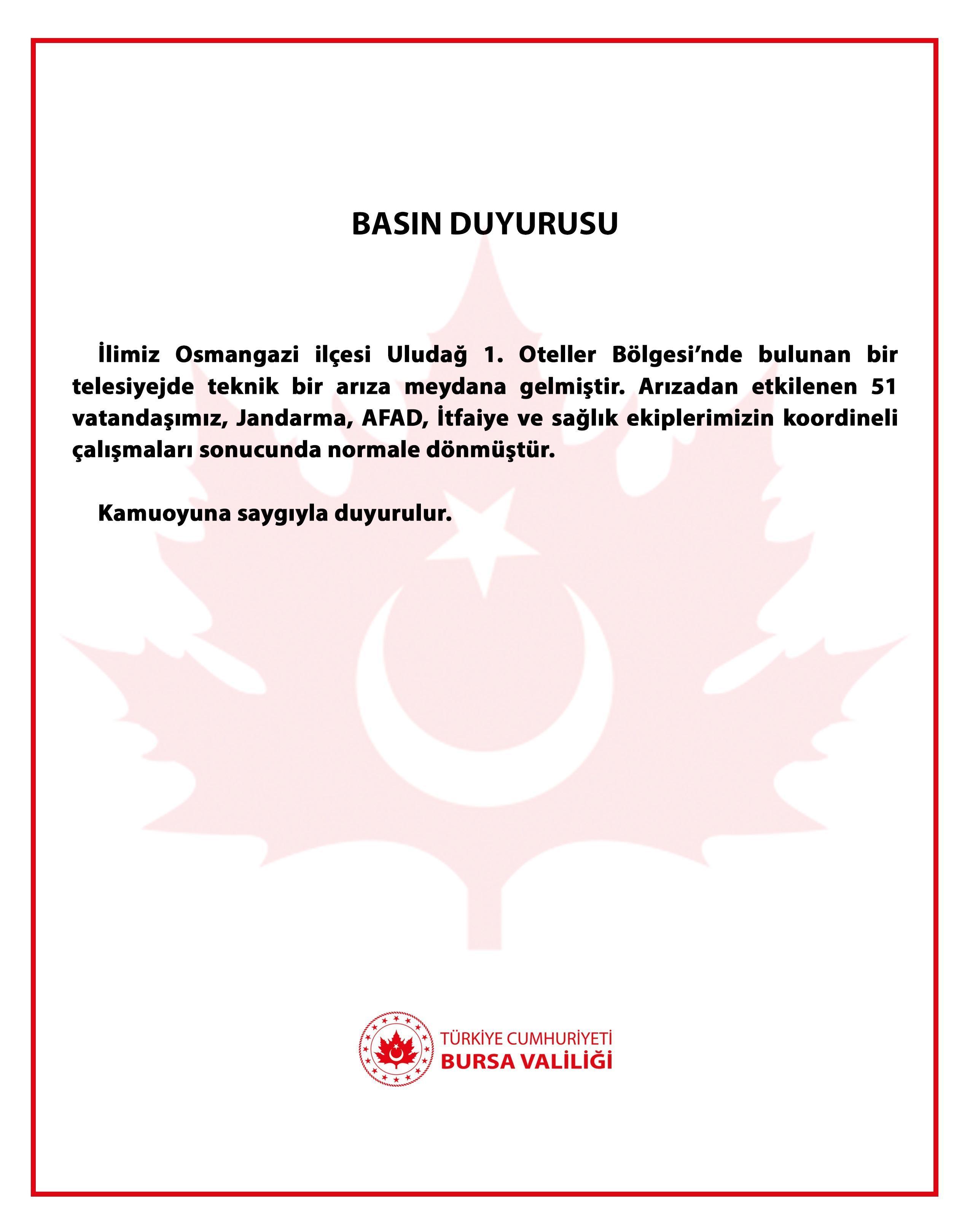 Uludağ'da telesiyej arızasının ardından mahsur kalan 51 kişi, yaklaşık 3 saat sonra kurtarıldı. Bursa Valiliği'nden yapılan açıklamada, "İlimiz Osmangazi ilçesi Uludağ 1. Oteller Bölgesi'nde bulunan bir telesiyejde teknik bir arıza meydana gelmiştir. Arızadan etkilenen 51 vatandaşımız, Jandarma, AFAD, İtfaiye ve sağlık ekiplerimizin koordineli çalışmaları sonucunda normale dönmüştür" ifadelerine yer verildi. (DHA)