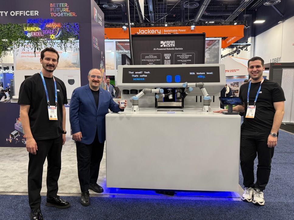 Varank’ın bir sonraki durağı, FARK LABS Teknoloji Geliştirme Merkezi’nin standı oldu. Fark Holding Yönetim Kurulu Başkanı Ahu Büyükkuşoğlu Serter, Varank’a yürütülen faaliyetler hakkında bilgi verdi. Stantta Thud e-Robotics tarafından geliştirilen X Barista adlı ürünü inceleyen Varank, şirketin CEO’su Önder Akyazıcı ve Takım Lideri Ocan Aydın’dan bilgi aldı. Şirketin CEO’su Akyazıcı, insan ustalığını robotlara aktararak fiziksel yapay zeka teknolojileri geliştiren bir Türk girişimi olduklarını belirterek, “İlk ürünümüz, X Barista. Türkiye’de 3 ay önce lansman yaptık. Kurumsal satışları başlattık. ABD pazarına açılmak için buradayız. Büyük ilgi görüyoruz” dedi.