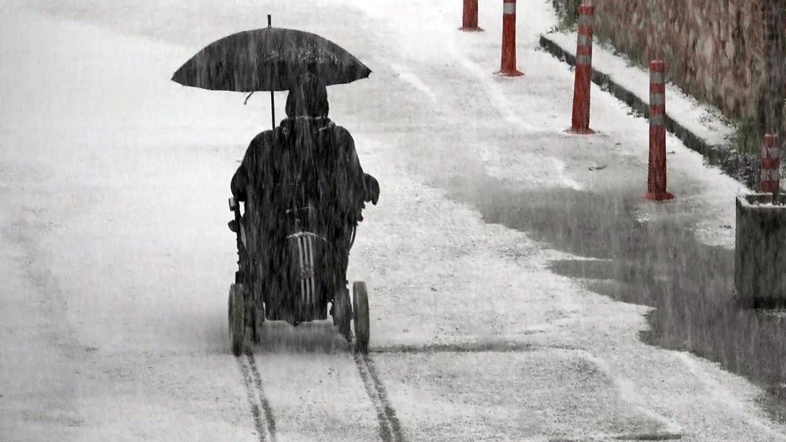 Tekerlekli sandalyesinde elindeki şemsiye ile karda ilerledi