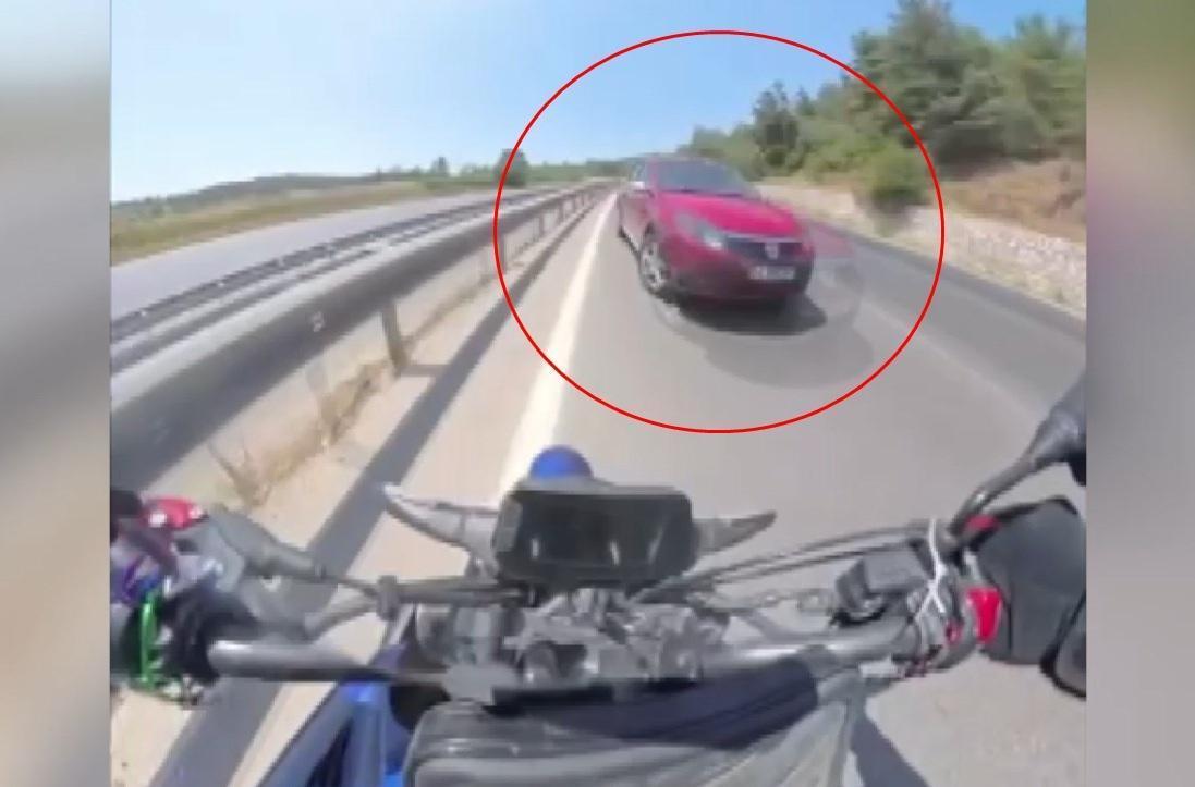 Olay, Osmangazi ilçesi Dürdane rampasında meydana geldi. Gemlik’ten Bursa yönüne giden motosiklet ile ters şeritte ilerleyen otomobil aniden burun buruna geldi. Motosiklet sürücüsü frene basıp, ani manevra yaparak kazayı önledi. O anlar motosikletlinin kask kamerasına yansıdı.