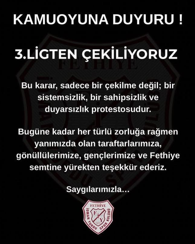 2024-2025 sezonunda Bölgesel Amatör Lig 8’inci Grup’ta şampiyon olarak TFF 3’üncü Lig’e yükselen Bursa temsilcisi Fethiye İdman Yurdu Spor Kulübü, sosyal medya hesabından ligden çekilme kararı aldığını duyurdu. Kararın, sistemsizlik, sahipsizlik ve duyarsızlık protestosu olduğu belirtilen açıklamada, “1973 yılında Bursa’nın Fethiye Mahallesi’nde kurulan Fethiye İdman Yurdu Spor Kulübü, bir semtin inancını, gençliğini ve tutkusunu sahaya yansıtarak son üç yılda Türk futbol tarihine eşine az rastlanır bir başarı hikayesi yazmıştır. 2021-2022 sezonunda Amatör Lig’de şampiyon olarak Süper Amatör Lig’e yükselen takımımız, 2023-2024 sezonunda Süper Amatör’de gösterdiği kararlılıkla bir kez daha şampiyon olmuş ve Bölgesel Amatör Lig’e adım atmıştır. Bu yükselişin tesadüf değil, inanç ve emek ürünü olduğunu 2024-2025 sezonunda BAL Ligi şampiyonu olarak 3. Lig’e çıkarak kanıtlamış bulunmaktayız. Üst üste alınan şampiyonluklar, mahalle ruhunun, özverinin ve saf futbol aşkının neleri başarabileceğini göstermiştir. Ancak ne yazık ki sportif başarı tek başına yeterli olmamaktadır. Ülkemizde profesyonel liglerde mücadele edebilmek, sadece futbolcu teriyle değil; güçlü bir altyapı, sağlam bir ulaşım ağı, sürdürülebilir maddi kaynaklar ve en önemlisi yerel yönetimlerin desteğiyle mümkündür. Bizler, bu zorlu yolda daha ileriye gidebilmek için elimizden geleni yaptık. Defalarca kez Bursa Büyükşehir Belediyesi’ne, Nilüfer Belediyesi’ne ve ilgili bakanlıklarımıza ulaşarak tesis, kulübümüze tahsis edilmiş bir otobüs ve genel destek taleplerimizi ilettik. Her görüşmemizde yaptıklarımızı, hedeflerimizi, kimseden lüks değil, sadece eşitlik ve adalet beklediğimizi dile getirdik.