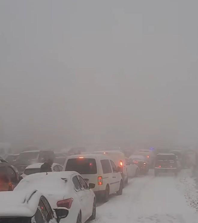 Uludağ yolunda metrelerce araç kuyruğunda beklemekten sıkılan bazı yolcular, araçlardan inip, kar altında trafiğin açılmasını beklerken kayan bazı araçlar ise kaza yaptı. Uludağ yolunda karlar altındaki dönüş çilesi cep telefonu kamerasıyla görüntülendi. (DHA)