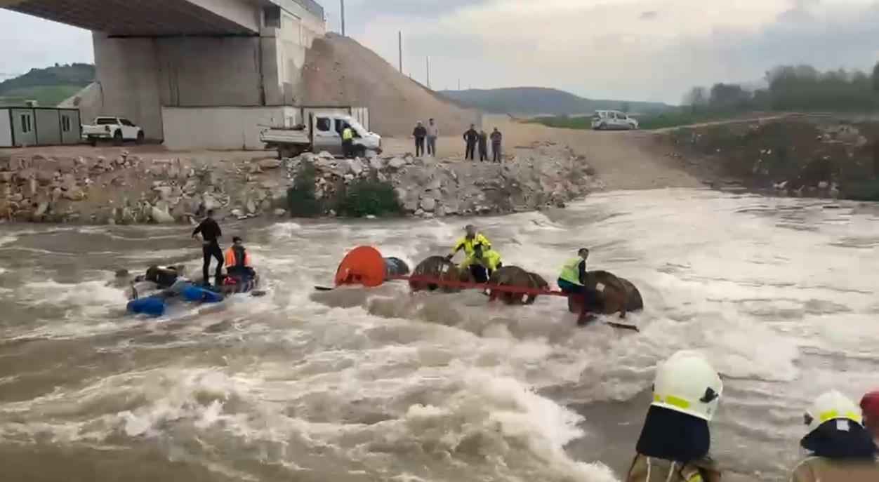 Olay, saat 17.00 sıralarında İnegöl ilçesi Ebeköy ile Papatya mahalleleri arasından geçen Kocasu Deresi’nde meydana geldi. İddiaya göre, hızlı tren hattının elektrik işlerini yapan işçilerin bulunduğu traktör, dereden karşı tarafa geçmek istedi. Akıntının etkisiyle traktör devrilirken, işçiler derede mahsur kaldı. İhbar üzerine olay yerine çok sayıda itfaiye, jandarma, AFAD ve arama kurtarma ekipleri sevk edildi. Ekiplerin kontrollü bir şekilde çalışması sonucu deredeki işçiler, vinç yardımıyla kısa sürede dereden çıkarılarak güvenli alana taşındı. İşçilerin kurtarılma anları cep telefonu kamerasına yansırken, durumlarının iyi olduğu öğrenildi. (DHA)
