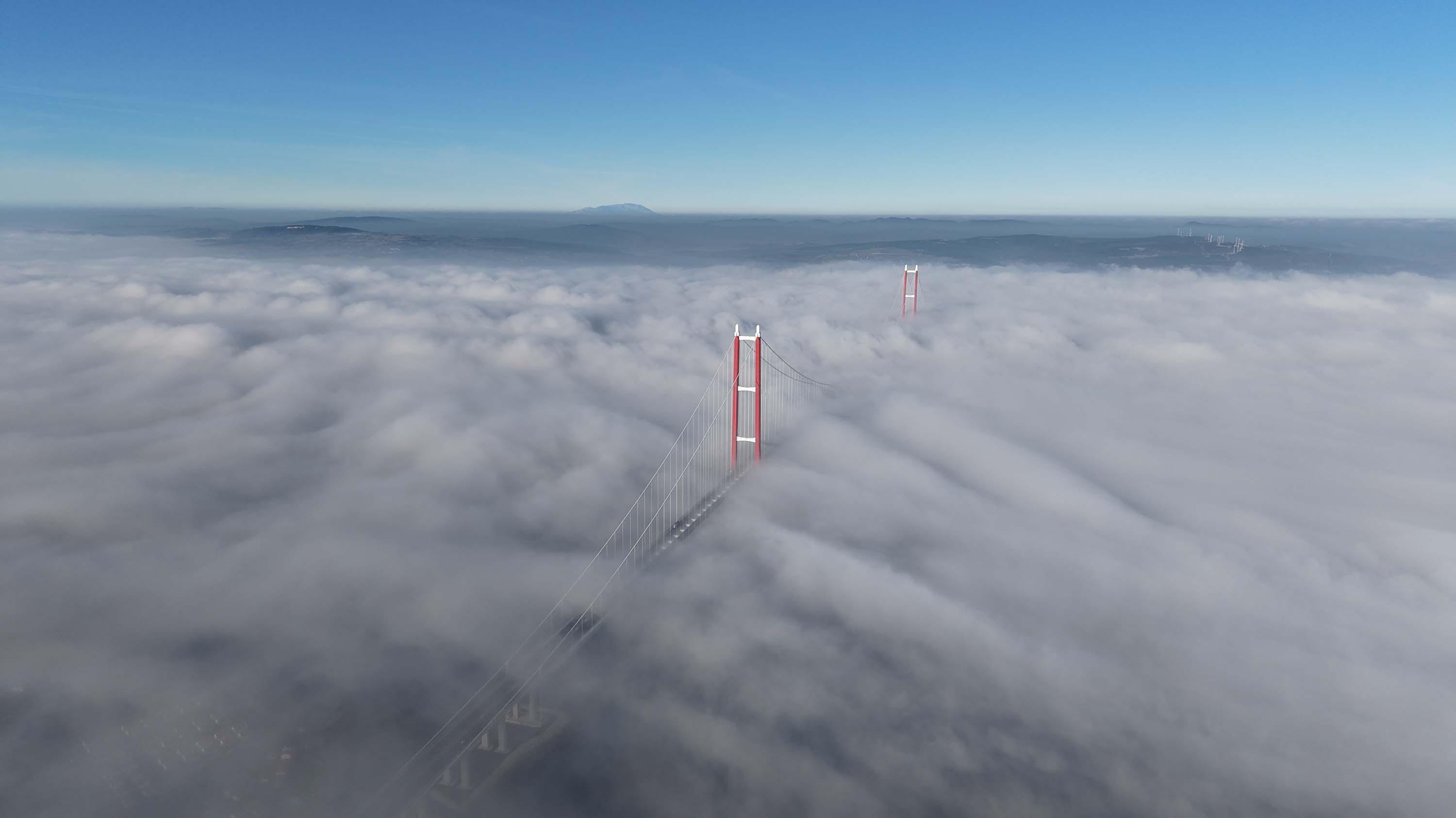 Kentte sabah saatlerinden itibaren etkili olan sis, deniz ulaşımında aksamalara neden oldu. Çanakkale Boğazı'nda transit gemi geçişlerinin ve Lapseki-Gelibolu hattındaki feribot seferlerinin durmasına neden olan yoğun siste, 2023 metre orta açıklığıyla dünyanın en uzun orta açıklığa sahip asma köprüsü olan 1915 Çanakkale Köprüsü de gözden kayboldu. 318 metre yüksekliğe sahip köprünün kuleleri ile ana halatları ancak 400 metre yukarıdan dronla görüntülendi. (DHA)