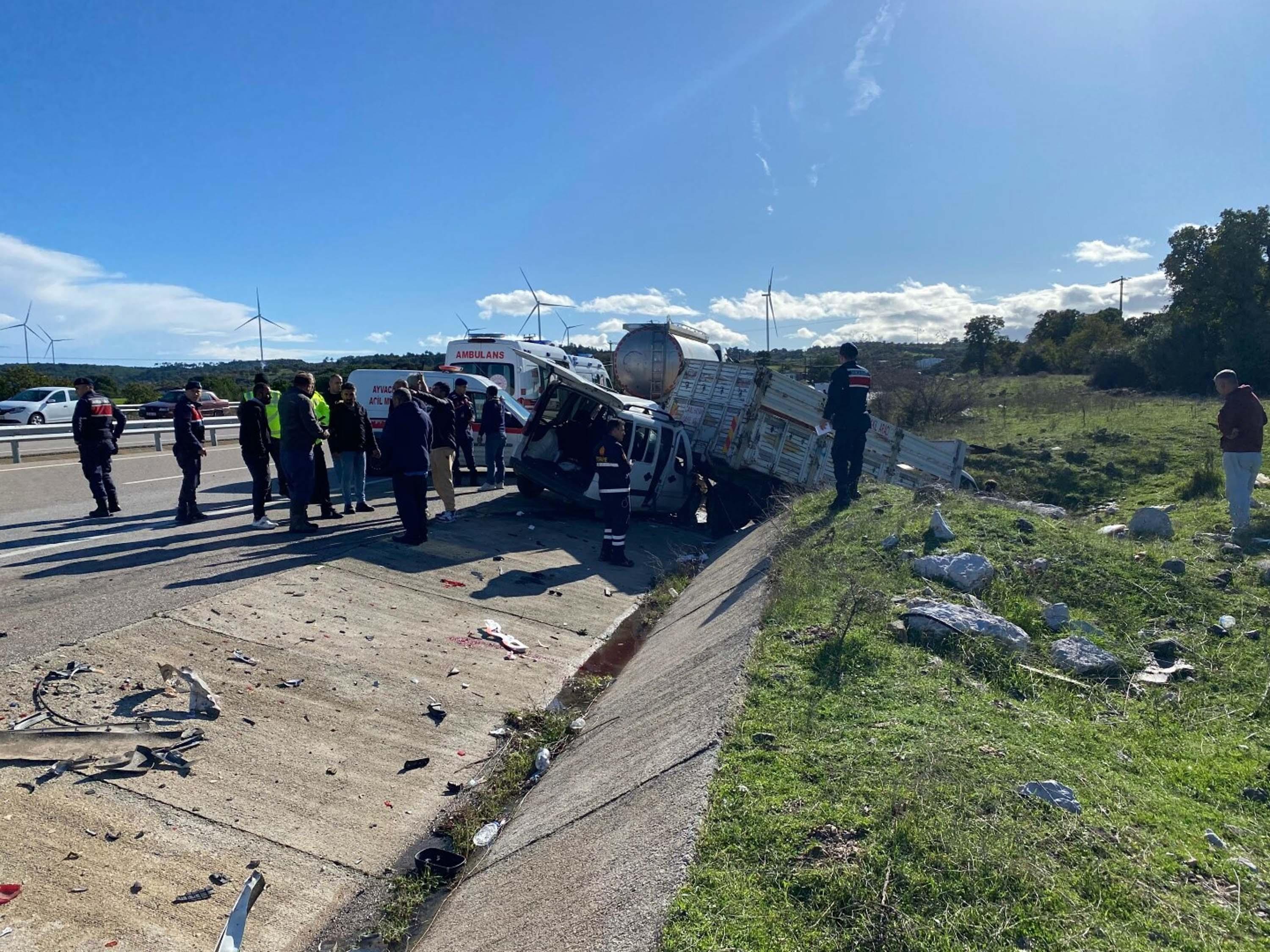 Kaza, saat 15.00 sıralarında Ayvacık ilçesi Sapanca köyü sapağında meydana geldi. Çanakkale istikametinden Balıkesir'in Edremit ilçesi istikametine gitmekte olan Hüseyin Alacaoğlu yönetimindeki 17 AAD 047 plakalı hafif ticari araç, aynı yönde ilerleyen İsmail Yılmaz yönetimindeki 17 SK 517 plakalı kamyonete arkadan çarptı. Kazayı gören diğer sürücüler, durumu jandarma ve sağlık ekiplerine bildirdi. Kazada hafif ticari araçtaki Hüseyin Alacaoğlu, Nazlı Alacaoğlu, Öykü Alacaoğlu, Atakan Alacaoğlu ile kamyonetteki İsmail Yılmaz yaralandı. Yaralılar, ambulanslarla hastaneye kaldırıldı. Hüseyin Alacaoğlu ile Nazlı Alacaoğlu'nun durumunun ciddiyetini koruduğu öğrenildi. Kazayla ilgili inceleme başlatıldı.(DHA)