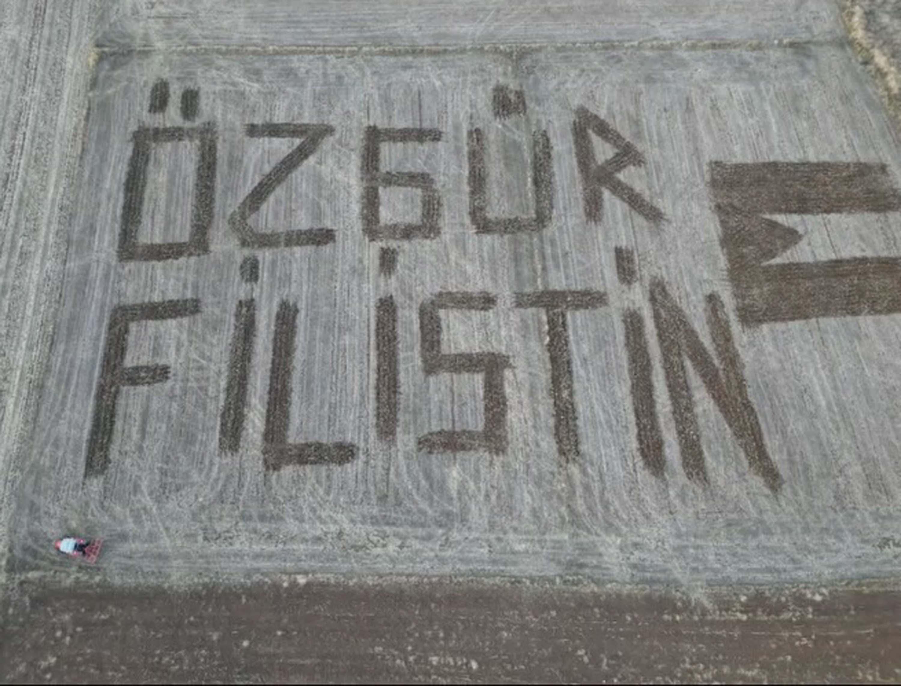 Nazif Cemhan ŞEN/ÇANAKKALE, (DHA)- ÇANAKKALE'nin Biga ilçesinde çiftçilik yapan Hüseyin Savaş ve Fikret Savaş kardeşler, tarlalarına traktörle 'Özgür Filistin' yazdı.