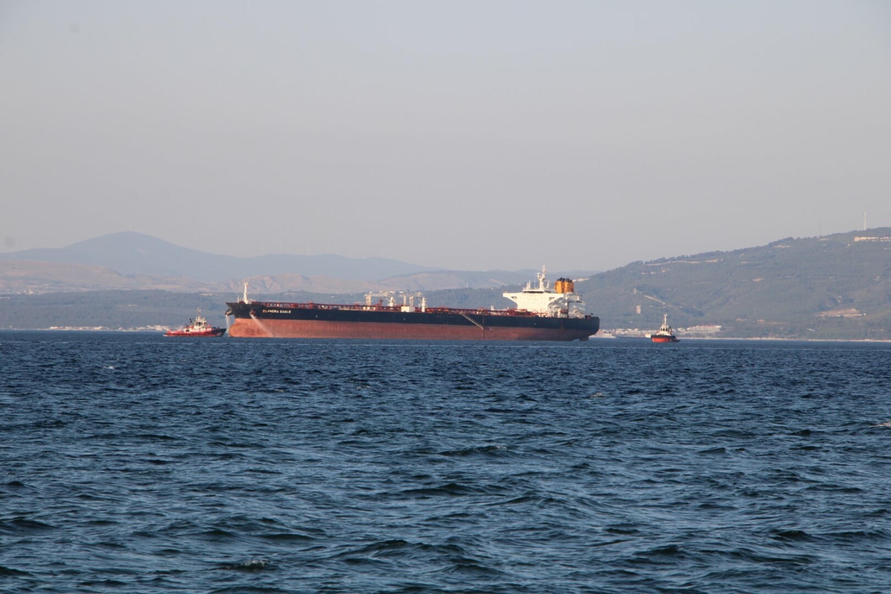Nazif Cemhan ŞEN/ ÇANAKKALE, (DHA)- ÇANAKKALE Boğazı'nda makine arızası yapan Marshall Adaları bayraklı boş tanker, römorkörler eşliğinde Bozcada 2’nolu Demir Sahası'na götürülüyor. Arıza nedeniyle boğaz çift yönlü trafiğe kapatıldı