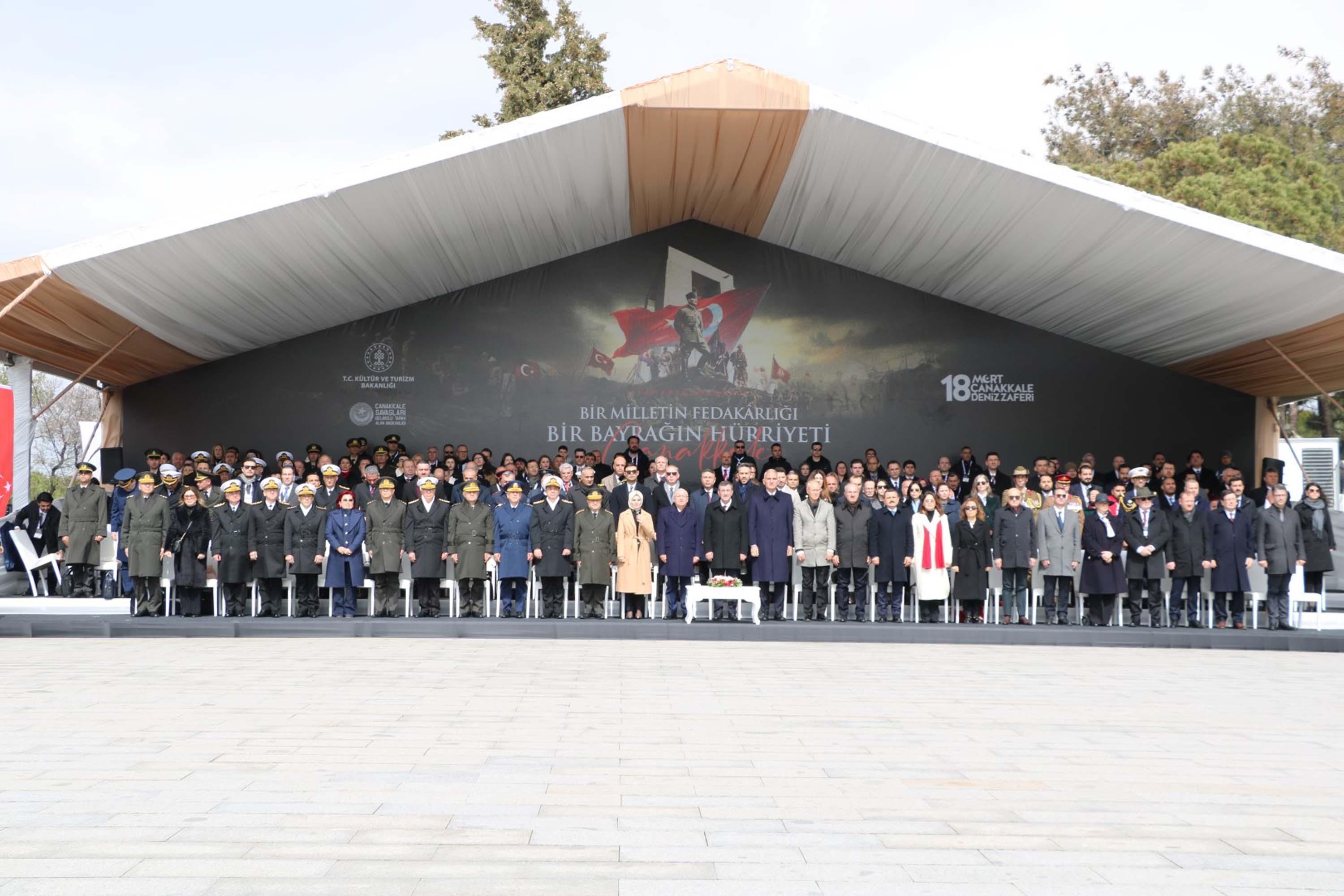 Tarihi Gelibolu Yarımadası'ndaki Şehitler Abidesi'nde 18 Mart Şehitleri Anma Günü ve Çanakkale Deniz Zaferi'nin 111'inci yıl dönümü nedeniyle tören düzenlendi. İki dev ekranın kurulduğu alanda, askeri bando tarafından marşlar çalındı. Törene; Cumhurbaşkanı Yardımcısı Cevdet Yılmaz, Milli Savunma Bakanı Yaşar Güler, Kültür ve Turizm Bakanı Mehmet Nuri Ersoy, Aile ve Sosyal Hizmetler Bakanı Mahinur Özdemir Göktaş, AK Parti Milletvekili Ayhan Gider, Gelibolu 2'nci Kolordu Komutanı Tümgeneral Mehmet Özeren, Amfibi Kolordu Komutanı Tümamiral Hüseyin Tığlı, Çanakkale Boğaz ve Garnizon Komutanı Tuğamiral Mustafa Biçen, Genelkurmay Başkanı Orgeneral Selçuk Bayraktaroğlu, Deniz Kuvvetleri Komutanı Oramiral Ercüment Tatlıoğlu, Hava Kuvvetleri Komutanı Orgeneral Ziya Cemal Kadıoğlu, Kara Kuvvetleri Komutanı Orgeneral Metin Tokel, Donanma Komutanı Oramiral Kadir Yıldız, 1'inci Ordu Komutanı Orgeneral Bahtiyar Ersay, Çanakkale Valisi Ömer Toraman, Çanakkale Belediye Başkanı Muharrem Erkek, Çanakkale Savaşları Gelibolu Tarihi Alan Başkanı İsmail Kaşdemir, İl Jandarma Komutanı Jandarma Kıdemli Albay Cemalettin Akyüz, Sahil Güvenlik Çanakkale Grup Komutanı SG. Yarbay Orhan Öğrenci, Avustralya'nın Ankara Büyükelçisi Sally-Anne Vincent, Yeni Zelanda Büyükelçi Yardımcısı Erin Morriss, Avustralya Savunma Ateşesi Albay Timothy Hawley, Avustralya'nın Çanakkale Konsolosu Laura Wauchope, çok sayıda şehit yakını, gazi ve gazi yakınları katıldı. Törende ilk olarak, Cumhurbaşkanı Yardımcısı Cevdet Yılmaz, Atatürk Anıtı'na çelenk bıraktı. Saygı duruşunda bulunulması ve saygı atışının ardından İstiklal Marşı okundu. Daha sonra Cumhurbaşkanı Recep Tayyip Erdoğan'ın 18 Mart Şehitleri Anma Günü ve Çanakkale Deniz Zaferi'ne ilişkin mesajı okundu.