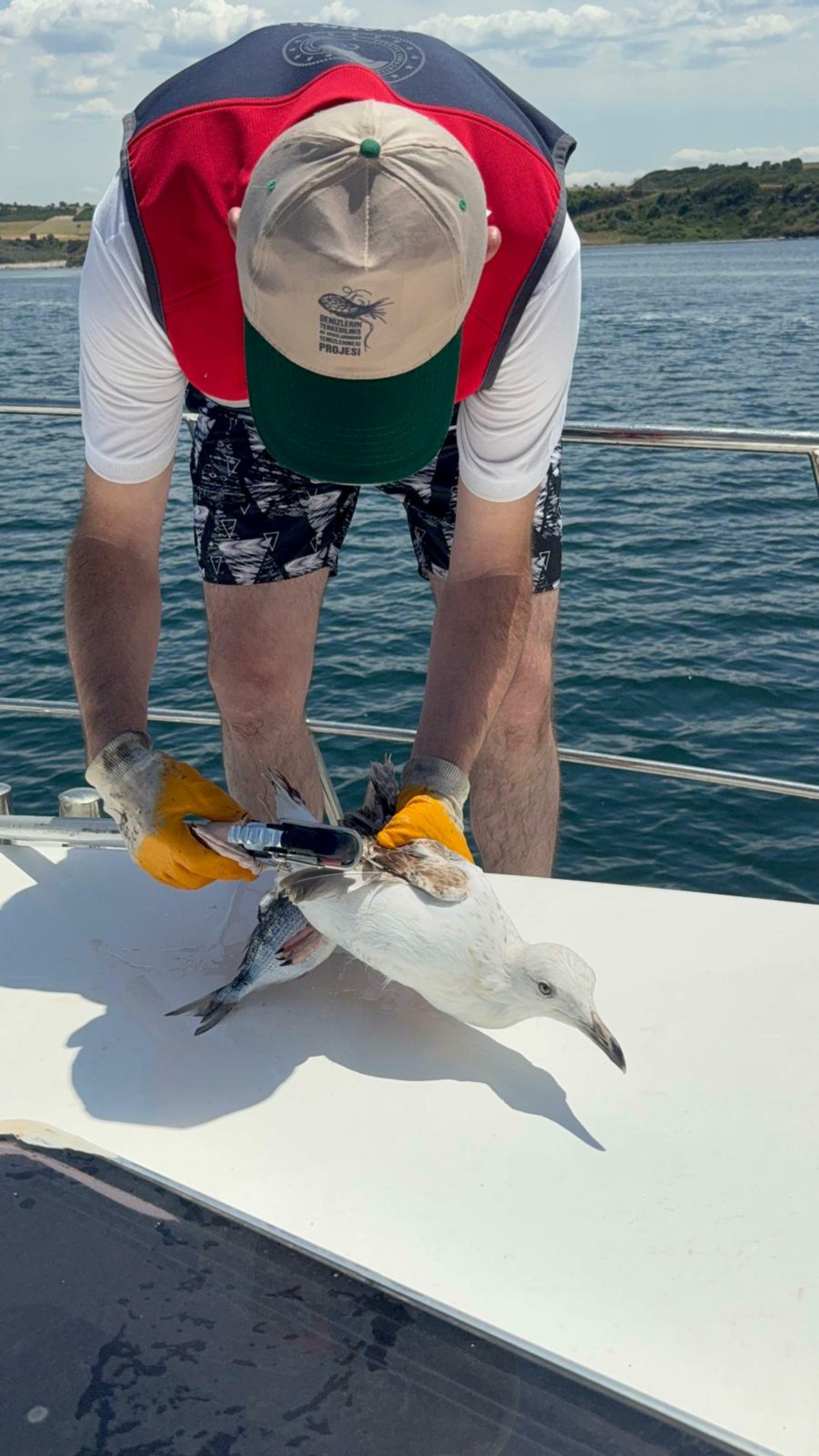 Nazif Cemhan ŞEN / ÇANAKKALE, (DHA)-ÇANAKKALE'de, İl Tarım ve Orman Müdürlüğü Su Ürünleri Kontrol ekiplerince Çanakkale Boğazı'nda gerçekleştirilen denetimler sırasında deniz bırakılmış, ucunda balık bulunan oltaya takılan martı kurtarıldı.