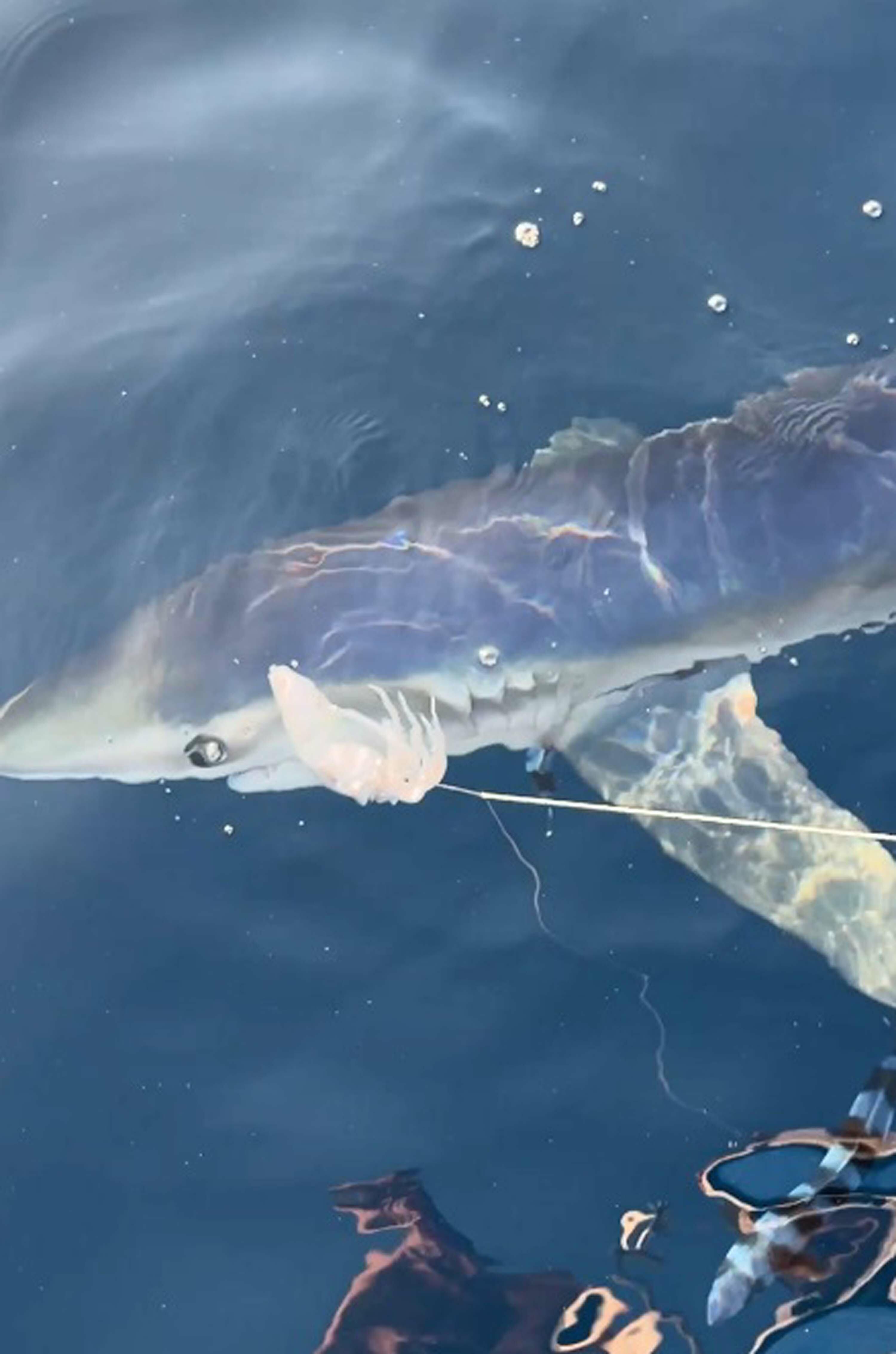 Gökçeada'da balıkçılık yapan İlker Özdemir, dün balık avlamak için teknesiyle denize açıldı. Parakete takımlarını denize bırakan Özdemir ve arkadaşları, bir süre sonra takımları toplamaya başladı. Özdemir, parakete takımı çekilirken içinde dev bir balık olduğunu gördü. Yüzeye yaklaşan balığın mavi köpek balığı olduğunu fark eden balıkçılar şaşkınlık yaşadı. Yüzeye yaklaştıktan sonra Özdemir oltayı koparıp, yaklaşık 100 kilogram ağırlığında ve 2,5 metre boyundaki mavi köpek balığını doğal ortamına bıraktı. Özdemir ve arkadaşları o anları cep telefonu kamerasıyla kaydetti.