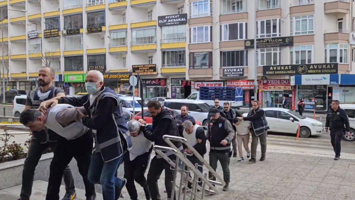 Çorum'un Alaca ilçesinde Nurettin Biçer'in öldüğü, 3 kişinin de yaralandığı kavgaya ilişkin gözaltına alınan 4 şüpheli, adliyeye sevk edildi. (DHA)
