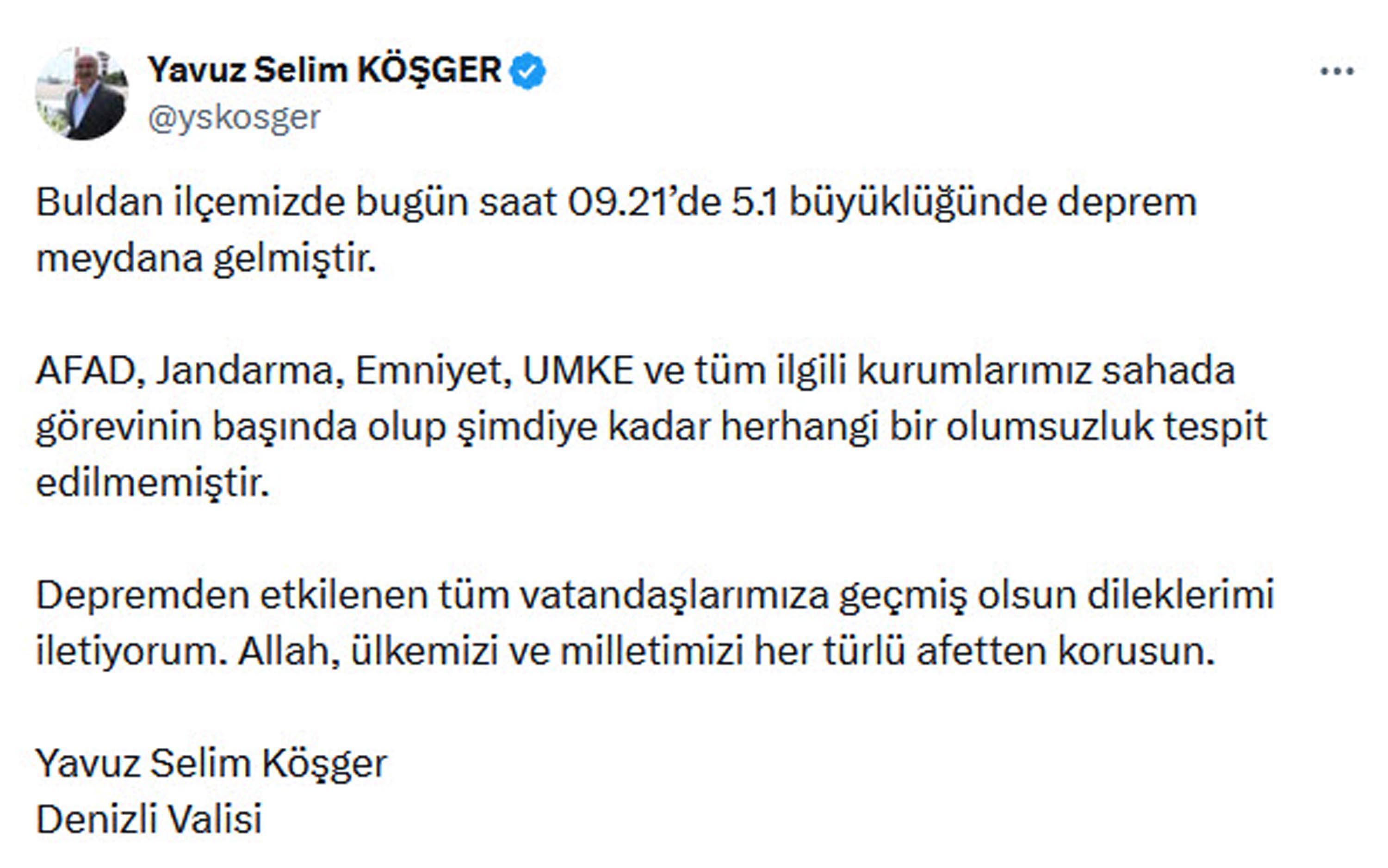 Denizli'de 5.1 büyüklüğünde deprem; Vali Köşger'den açıklama