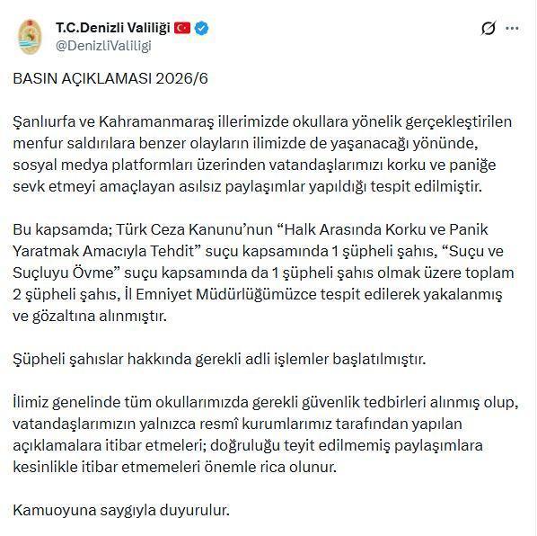 Denizli Valiliği'nden yapılan açıklamada, Şanlıurfa ve Kahramanmaraş'da okullara yönelik gerçekleştirilen saldırılara benzer olayların kentte de yaşanacağı yönünde, sanal medya platformları üzerinden vatandaşları korku ve paniğe sevk etmeyi amaçlayan asılsız paylaşımlar yapıldığının tespit edildiği bildirildi.