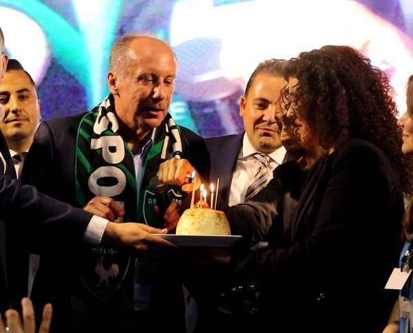 İnce'ye konuşmasının sonunda partililer, geçmiş doğum günü nedeniyle sürpriz yaptı. Partililerin getirdiği pastanın mumlarını üfleyen İnce, daha sonra dansını yaptı. Partisinin milletvekili adaylarını tanıtan İnce, güvercin uçurduktan sonra Denizli'den ayrıldı. (DHA)