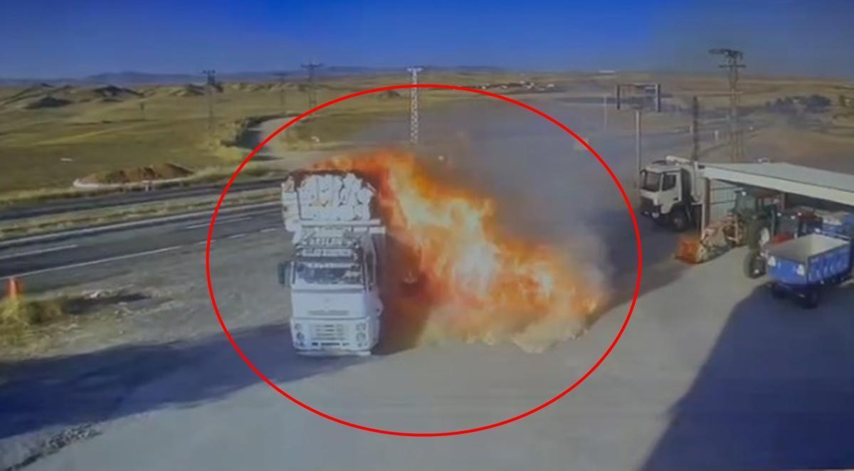 Alev alan saman yüklü kamyon, akaryakıt istasyonuna girdi; o anlar kamerada