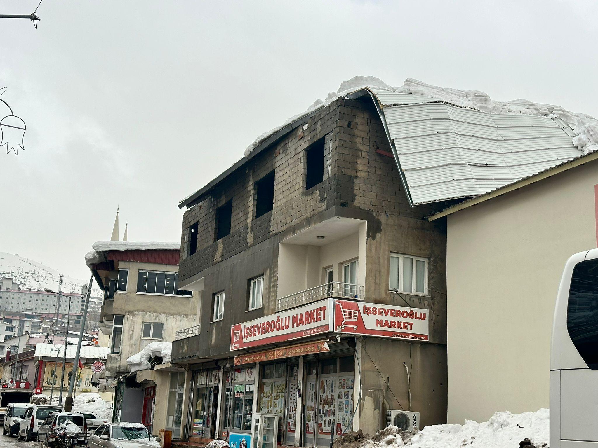 Beytüşşebap ilçesinde yaklaşık 45 gündür aralıklarla etkili olan kar yağışı, yaşamı olumsuz etkilemeye devam ediyor. İlçe merkezinde bazı binaların çatılarında biriken yoğun kar kütleleri tehlike oluşturuyor. Yüke dayanamayan bazı çatılar çökerken, bir binanın çatısından düşen kar kütlesi, park halindeki bir otomobilin üzerine düşerek hasara yol açtı. Beytüşşebap Belediyesi’nin daha önce Cumhuriyet Caddesi’ndeki iş yeri sahiplerini çatı temizliği konusunda uyardığı, gerekli önlemleri almayanlar hakkında cezai işlem uygulanacağını anonslarla duyurduğu öğrenildi. Bazıları çatılarını kendi imkanlarıyla temizlemeye çalışırken, belediye ekipleri de ilçe genelinde biriken karları iş makineleriyle ilçe dışına taşıyor. (DHA)