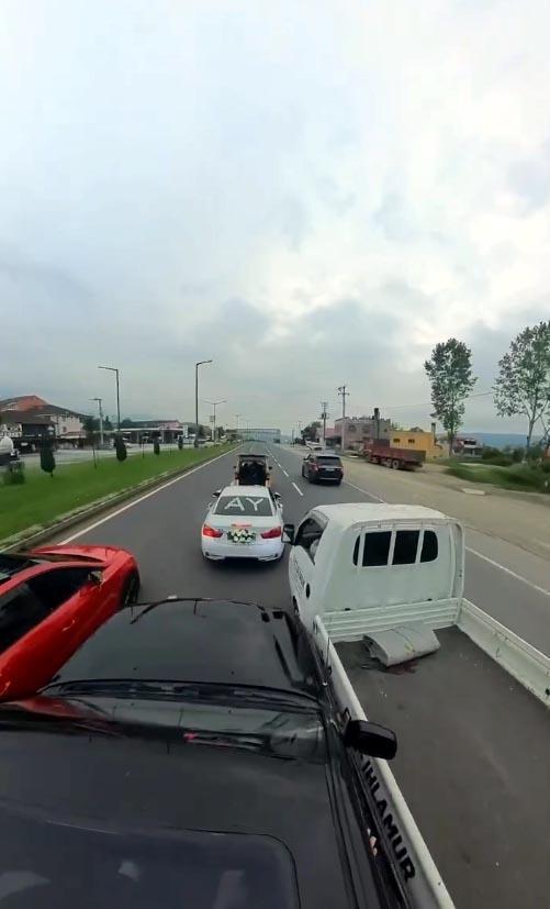 Mutlu YUCA/DÜZCE, (DHA)- DÜZCE'de, yakınının düğüne katılan K.D. cipiyle konvoy halinde ilerlerken gelin arabasının arkasına geçmek isteyen diğer araçlara izin vermedi, bu sırada bir kamyonete çarptı. O anlar kameraya yansırken, sürücüye, 'Trafik güvenliğini tehlikeye sokmak' suçundan 14 bin 780 TL ceza kesildi.