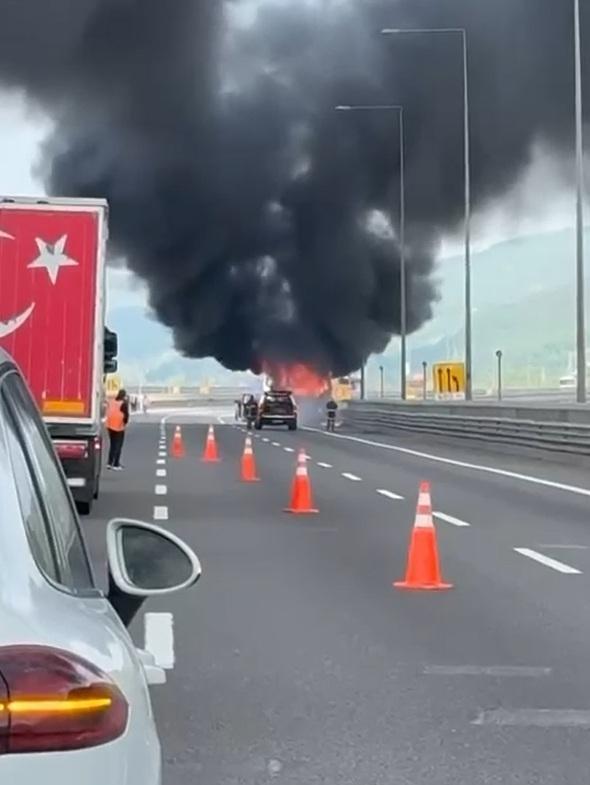 İstanbul istikametine giden Kenan B. idaresindeki, 34 MTC 935 plakalı, içerisinde 33 kişinin bulunduğu yolcu otobüsü, saat 10.00 sıralarında Anadolu Otoyolu'nun Bolu Dağı 1’inci Viyadük mevkisinde motor kısmından alev aldı. Sürücü durumu fark edince otobüsü emniyet şeridine park edip, yolcuları tahliye etti. Büyüyen alevler tüm otobüsü sardı. İhbarla olay yerine gelen itfaiye ekipleri, yangını söndürdü. Otobüs kullanılmaz hale gelirken, yolcular başka bir araçla yollarına devam etti. Yangınla ilgili soruşturma başlatıldı. (DHA)