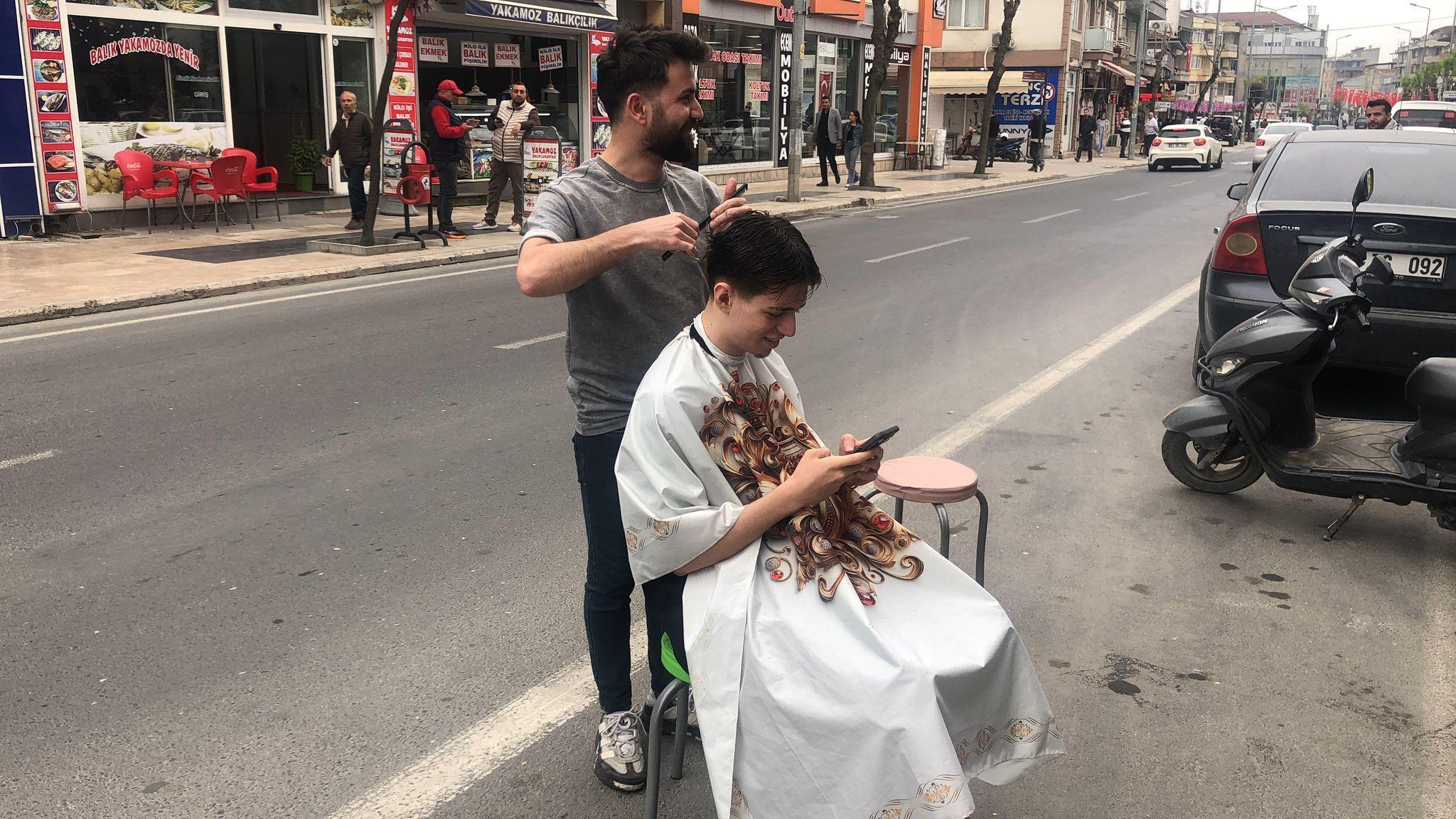Musa KESKİN/DÜZCE, (DHA)- MARMARA Denizi’nde İstanbul açıklarında meydana gelen 6.2 büyüklüğündeki deprem Düzce’de de hissedildi. Berber Fatih Konur, deprem nedeniyle müşterisinin yarım kalan saç tıraşını sokakta yaptı.