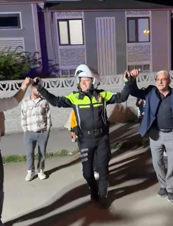 Düğün konvoyundaki araçları yoldan kaldıran polis, davet üzerine halaya katıldı