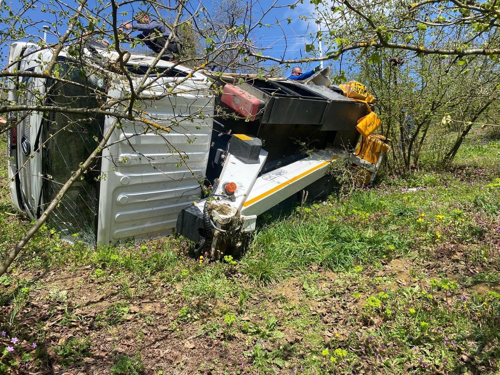 Musa KESKİN/DÜZCE, (DHA)- DÜZCE'de, direksiyon başında kalp krizi geçiren Murat Ö.’nün kullandığı sepetli vinç kamyoneti fındık bahçesine devrildi. Kazada, Murat Ö. yaralandı.