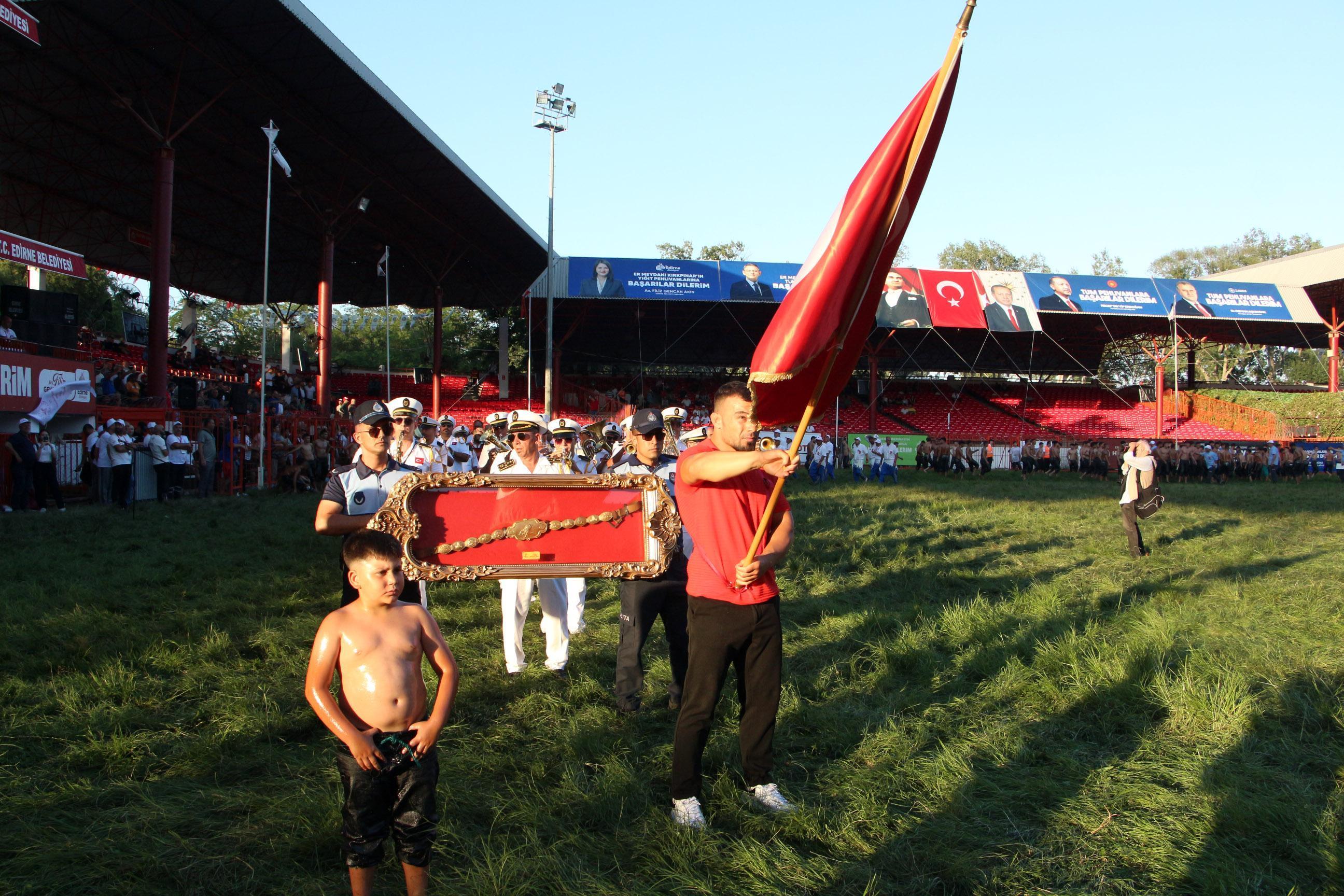 Tören, Edirne Belediye bandosu eşliğinde bir dakikalık saygı duruşu ve İstiklal Marşı'nın okunması ile başlarken; Türk bayrağını göndere Tarihi Kırkpınar Yağlı Güreşleri Başpehlivanı Yusuf Can Zeybek çekti. İstiklal Marşı'nın okunmasının ardından Beyazıt Sansı'nın söz ve bestesi olan Kırkpınar Marşı, Edirne Belediye Bandosu'nun eşliğinde söylendi.