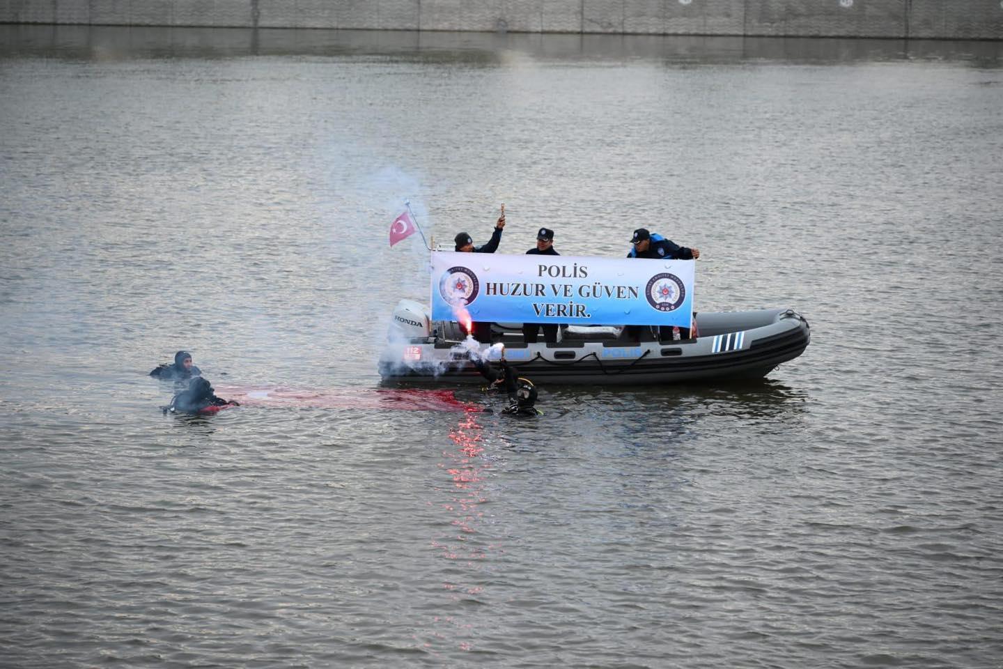 Resepsiyonda dalgıç polisler de Meriç Nehri'nde bir gösteri sundu. Polisler, zodyak botla nehre açılarak dalış yaptı ve suyun üzerinde Türk bayrağı açtı. Bottaki polisler ise meşaleler eşliğinde ‘Polis Huzur ve Güven Verir’ yazılı pankart açtı. Katılımcılar gösteriyi büyük bir ilgiyle izledi. Gösterinin dronla çekilmiş video klibi ise Edirne Emniyet Müdürlüğü’nün sosyal medya hesaplarında yayınlandı. Video kısa sürede çok sayıda izlenme ve beğeni aldı. (DHA)