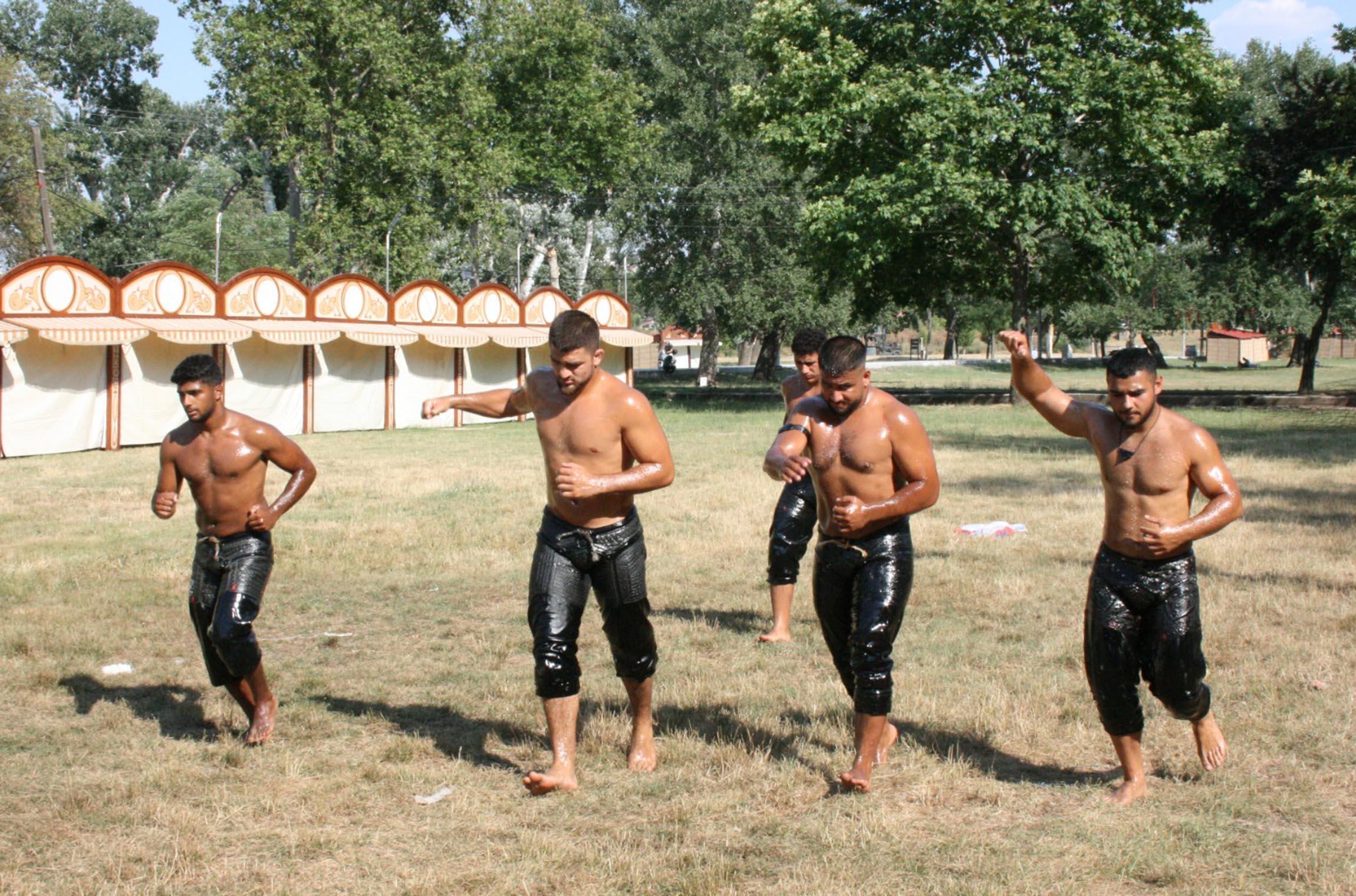 Batuhan SEVER/EDİRNE, (DHA)- EDİRNE'de bu yıl 664'üncü kez gerçekleştirilecek olan Tarihi Kırkpınar Yağlı Güreşleri'ne günler kala Edirneli pehlivanlar, güreşlerin yapıldığı Sarayiçi'nde 37 dereceyi bulan sıcaklıkta çalışmalarını sürdürüyor.