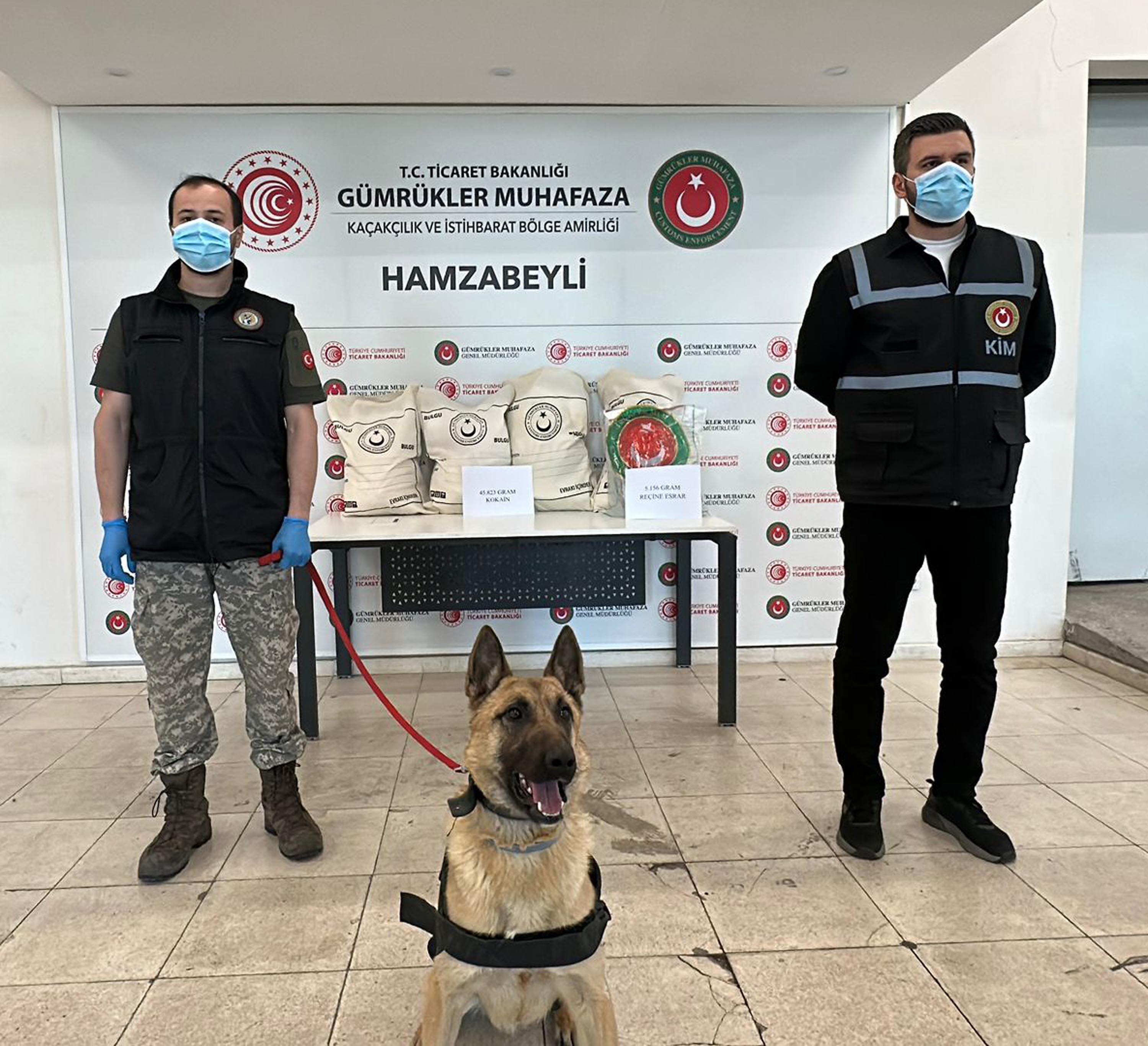 Hamzabeyli Gümrük Muhafaza Kaçakçılık ve İstihbarat Bölge Amirliği ekipleri, yurda giriş yapmak üzere gelen kapalı kasa minibüsü şüphe üzerine X-ray taramasına sevk etti. Minibüste eğitimli köpek Bodri ile yapılan aramada, zemin kaplamasının altına gizlenmiş, 45 kilo 823 gram kokain ele geçirildi.