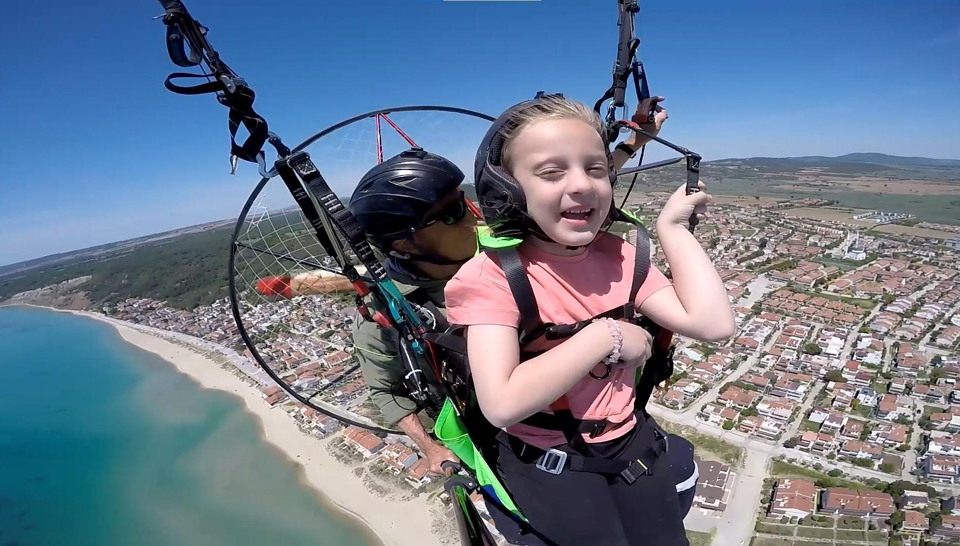 Ünsal YÜCEL/EDİRNE, (DHA)- EDİRNE’nin Saros Körfezi’ne kıyısı bulunan Keşan ilçesine bağlı Erikli köyü sahilinde paramotor pilotu eşliğinde uçuş gerçekleştiren ilkokul 2’nci sınıf öğrencisi Zeynep Beren (7), gökyüzünde İstiklal Marşı’nın ilk 2 kıtasını ezbere okudu.