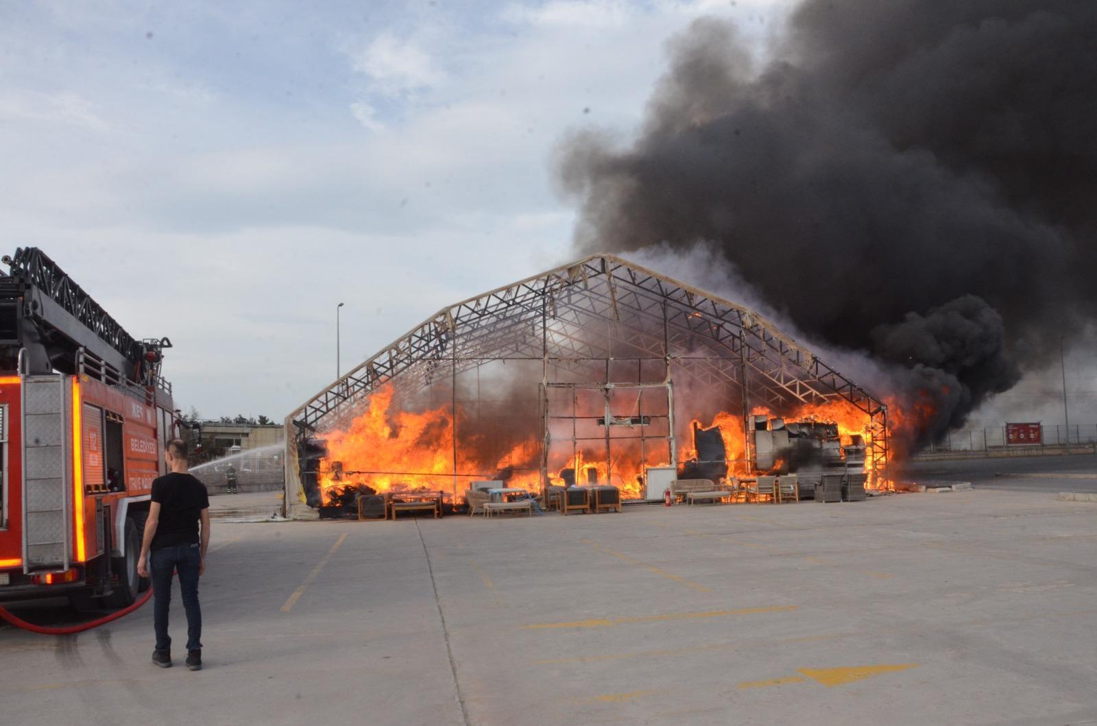Mobilya satılan çadır alev alev yandı; söndürme çalışmalarına polis, TOMA ile destek verildi