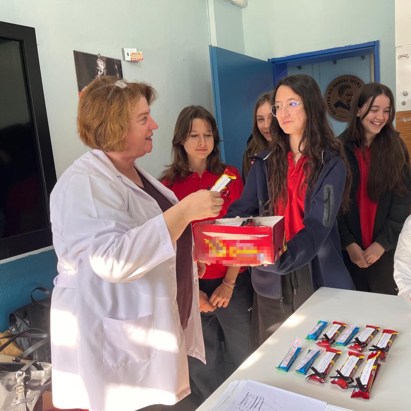 Öğrenciler, üzerine notlar yazdıkları çikolataları öğretmenlerine ikram etti