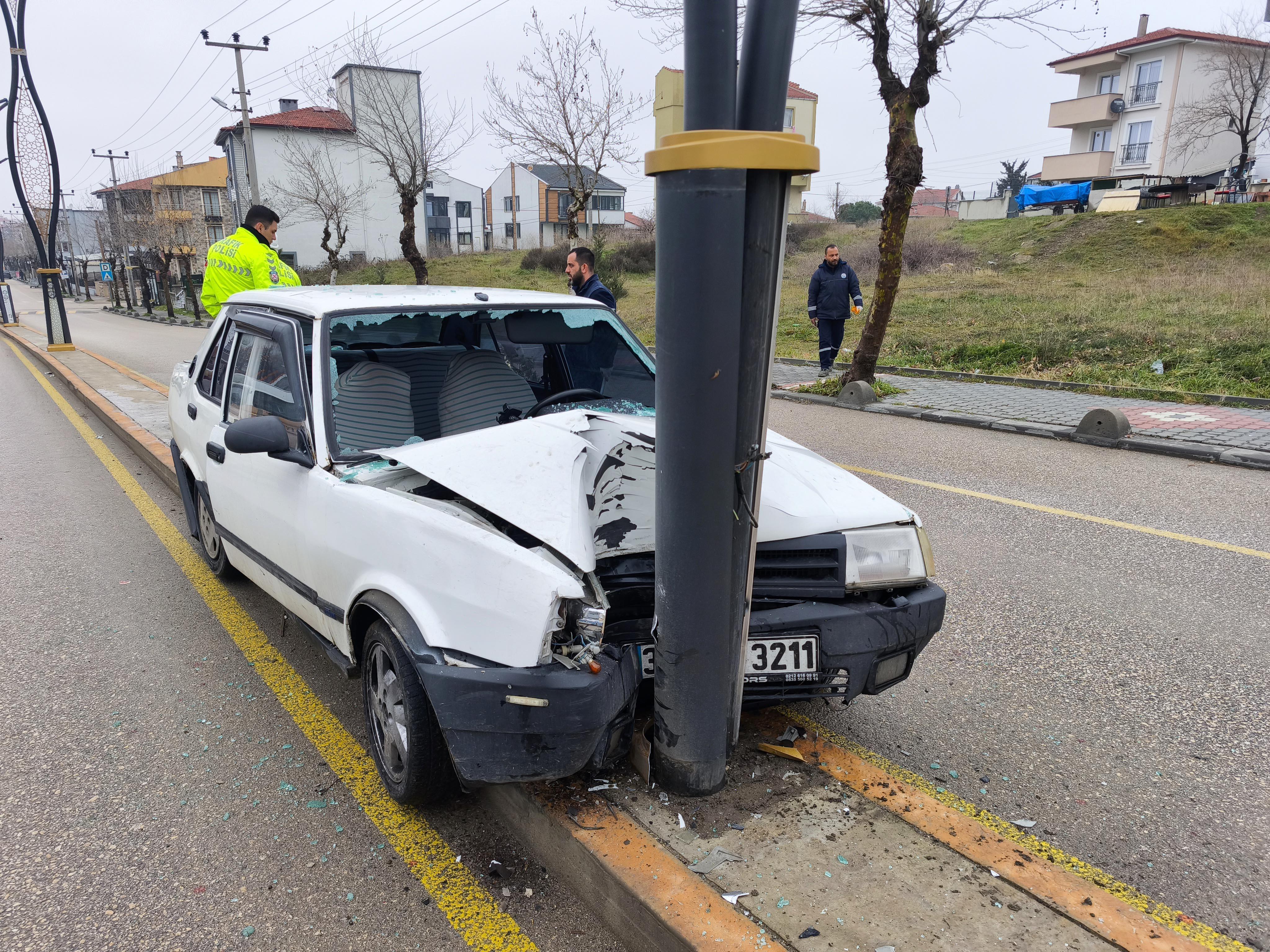 Kaza, saat 14.00 sıralarında, Mustafa Kemal Paşa Mahallesi Rasim Ergene Caddesi’nde meydana geldi. Çarşı merkezinden Keşan Adalet Sarayı yönüne giden Y.Ç. (40), yönetimindeki 34 UH 3211 plakalı otomobilin direksiyon kontrolünü yitirdi. Refüje çıkan otomobil önce beton çiçekliğe ardından da aydınlatma direğine çarptı. Sürücü Y.Ç. ile otomobilde bulunan H.T. yaralandı.