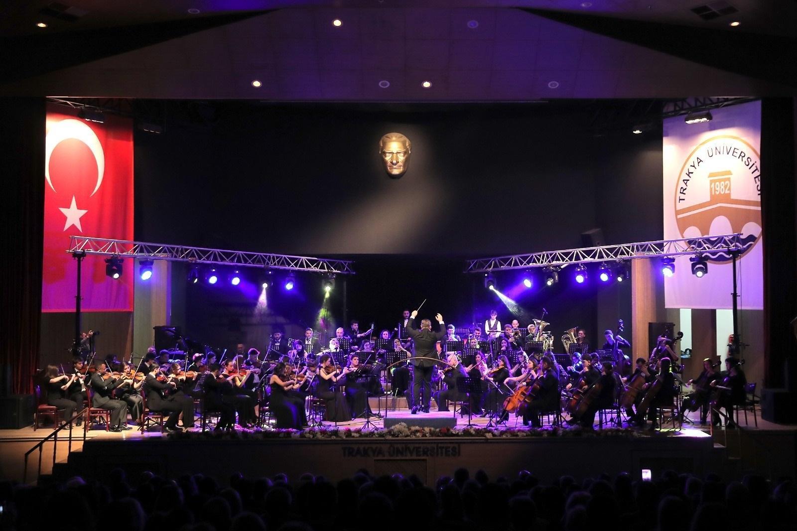 Şefliğini Prof. Tanju Araboğlu’nun üstlendiği konserde, Türk müziğinin hafızalara kazınan eserleri senfonik düzenlemelerle seslendirildi. Balkan Senfoni Orkestrası tarafından icra edilen eserler, izleyicilerden büyük beğeni topladı. Konsere Trakya Üniversitesi Rektörü Prof. Dr. Mustafa Hatipler ile Rektör Yardımcıları Prof. Dr. Mustafa Tan ve Prof. Dr. Eylem Bayır, Genel Sekreter Hüseyin Türkel, dekanlar, müdürler, akademisyenler, öğrenciler ve Edirne halkı yoğun ilgi gösterdi. Çocuk Senfoni Orkestrası’nın, Dmitri Shostakoviç’in 2'nci Valsi ile ‘Memleketim’ eserini seslendirmesinin ardından sahne alan Balkan Senfoni Orkestrası, film müziklerinden Türk tangolarına, unutulmaz pop şarkılarının senfonik düzenlemelerine uzanan zengin bir repertuvar seslendirdi. Orkestraya, Devlet Konservatuvarı Öğretim Üyeleri Dr. Öğr Üyesi Burcu Coşkun, Dr. Öğr Üyesi Deniz Yavuz ve Dr. Öğr Üyesi Gökçe Güven sesleriyle renk katarken, Filibe Opera ve Balesi’nde görev yapan konuk sanatçı bariton Alper Ünlütürk etkileyici performansıyla dinleyicilere unutulmaz anlar yaşattı. ‘Ah İstanbul’ adlı eserde ise Dr. Öğr. Üyesi Vahdet Çalışkan‘ın klarnet solosu alkış aldı. Konser sonunda ayakta alkışlanan sanatçılara, Trakya Üniversitesi Rektörü Prof. Dr. Mustafa Hatipler, Rektör Yardımcıları Prof. Dr. Mustafa Tan ve Prof. Dr. Eylem Bayır tarafından çiçek takdim edildi. (DHA)