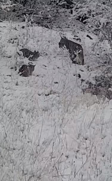 Kar yağışının etkili olduğu Karakoçan ilçesine bağlı Balcalı köyü yolunda ormanlık alanda bir grup vaşak görüldü. Kenan Çavundur tarafından kaydedilen görüntülerde, karla kaplı alanda yetişkin vaşağın avladığı hayvanı yediği, 2 yavru vaşağın ise yakında hareketsiz şekilde beklediği anlar yer aldı. Vaşaklar daha sonra gözden kayboldu. (DHA)