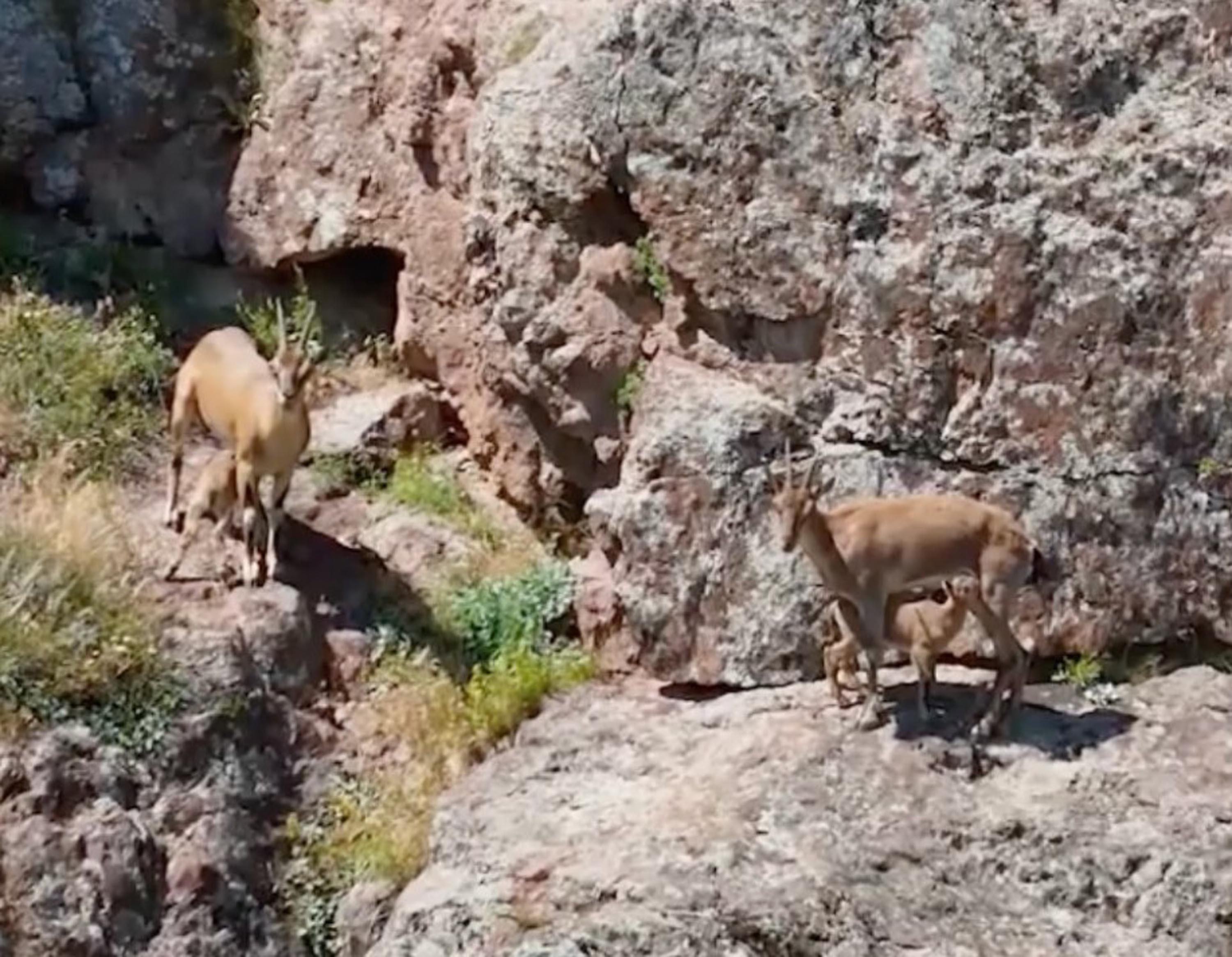 Muzaffer KOŞAN/ERZİNCAN, (DHA)- Erzincan’ın Kemah ilçesinde yavrularını emziren 2 dağ keçisi, doğa fotoğrafçısı Fatih Civan tarafından dronla görüntülendi.