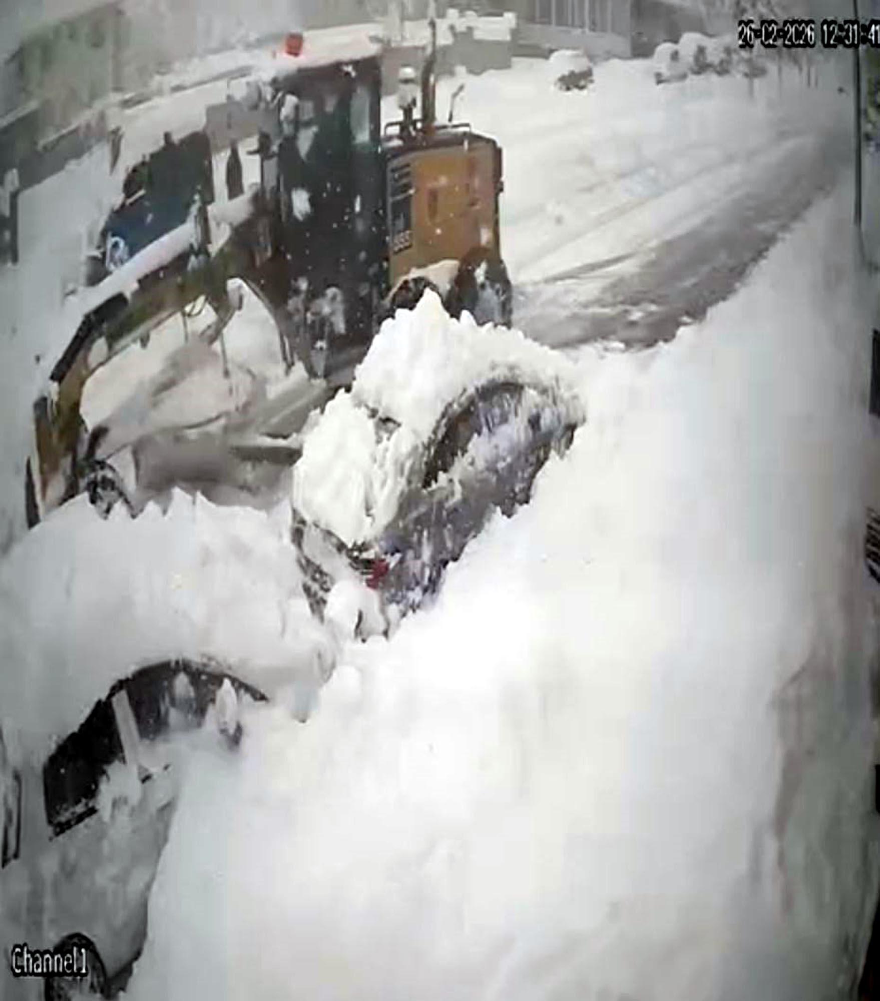 Üzümlü ilçe merkezinde yol açma çalışması yapan iş makinesi, yol kenarında park halinde bulunan ve üzerleri tamamen karla kaplanan 2 otomobilden birine çarptı. İş makinesinin çarptığı otomobil de önündekine çarptı. Kaza, güvenlik kamerasına yansıdı. (DHA)