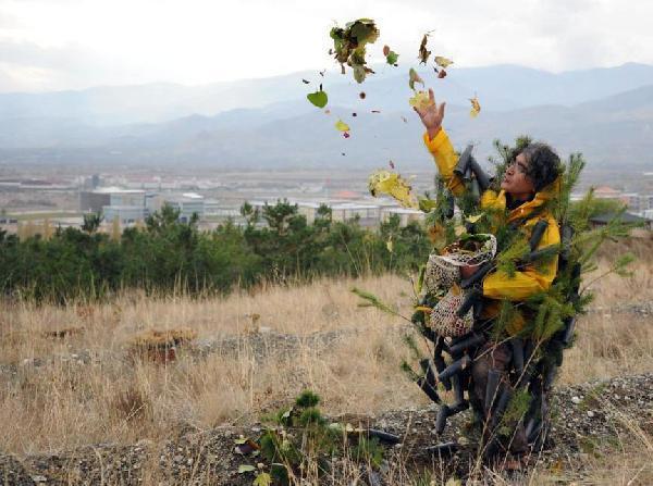 Kavukcu, Erzurum'dan Erzincan'a giderken yolculuğu sırasında; çalılar ve sonbahar renklerini bünyesinde barındıran yapraklar gibi doğada bulduğu malzemeleri kendi çalışma ilkeleri doğrultusunda toplayarak alışveriş filelerinin içerisinde taşıdı. Erzincan'a vardığında da önceki çalışmalarında görüldüğü gibi orman yangınlarına dikkat çekmek amacıyla yangından zarar görmüş bir ağacı; kimi zaman kaldırımda, kimi zamansa araç trafiğinin devam ettiği alanlarda sürüklediğine benzer şekilde bu kez; gerçekleştirdiği yolculuk sırasında topladığı doğal malzemelerle birlikte, vücuduna enso yetiştirme kabı yer alan fidanları bağlayarak kent merkezinden fidan dikim alanına kadar yürüdü. Sanatçı, vücudunu kaplayan doğal malzemeler ve çok sayıdaki fidan tüpleriyle adeta yürüyen fidanlığa dönüştü.