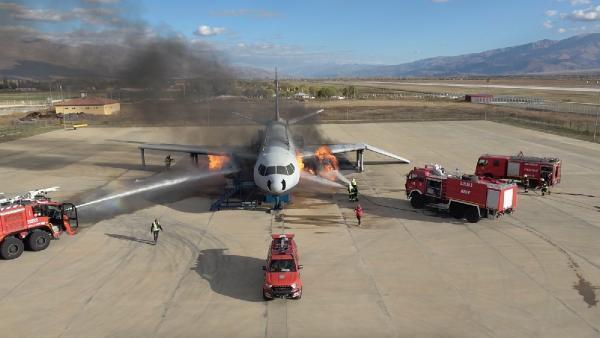 Muzaffer KOŞAN/ERZİNCAN, (DHA)- ERZİNCAN Yıldırım Akbulut Havalimanı’nda, senaryo gereği 155 yolcu, 6 mürettebatın bulunduğu uçakta çıkan yangına müdahale ve yaralıları kurtarma tatbikatı gerçeği aratmadı.