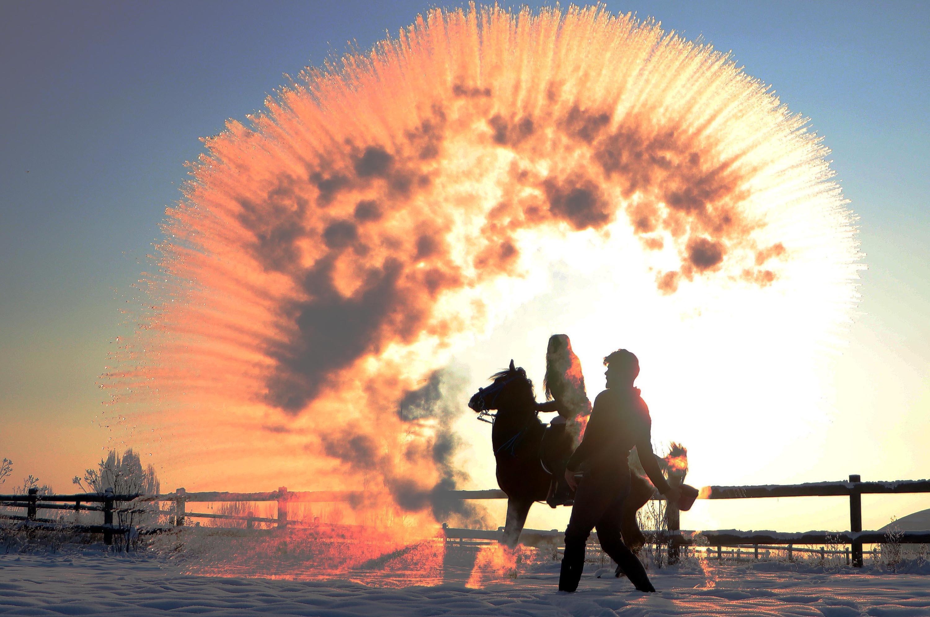 Doğu Anadolu Bölgesi'nde dondurucu soğuk yaşamı olumsuz etkilerken, fotoğraf tutkunları için ise güzel manzaralar ortaya çıktı. Atatürk Üniversitesi yerleşkesindeki Manej Alanı ve Atçılık Koordinatörlüğü’ndeki görevlilerin havaya attığı sıcak suyun donarak kristalleşmesi, ilgi çeken görüntüler oluşturdu. Sema Tekin, "Özellikle sabah ya da akşamüzeri havaya atılan sıcak su anında kara dönüşüyor ve güneşin de verdiği kırmızı renkle tablo gibi görüntü oluşturuyor. At binmek için buraya gelenler tarafından sıkça yapılan bu şov büyük ilgi görüyor" diye konuştu.